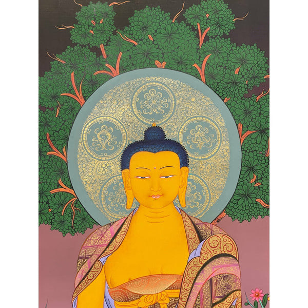 Shakyamuni Buddha, the historical Buddha, is considered the founder of Buddhist philosophy and is often referred to simply as "the Buddha." He is believed to have lived around 420 BC, spending much of his life spreading the teachings of Dharma. In Buddhism, each "kalpa" (a Buddhist eon) has its own Buddha whose teachings, over time, are forgotten before the next Buddha arrives. Shakyamuni’s life is richly detailed in the Thangka known as Life of Buddha, which portrays his journey to enlightenment.