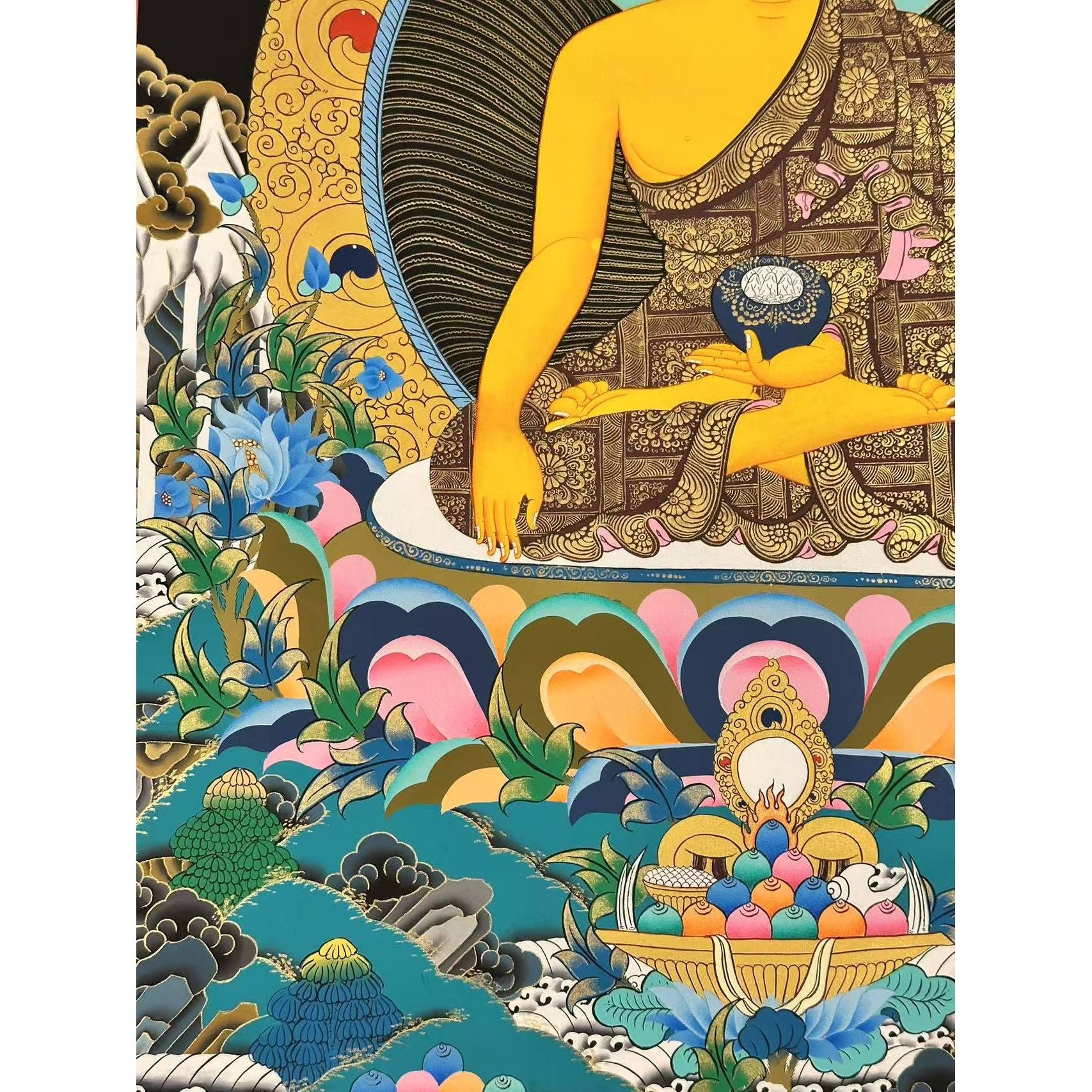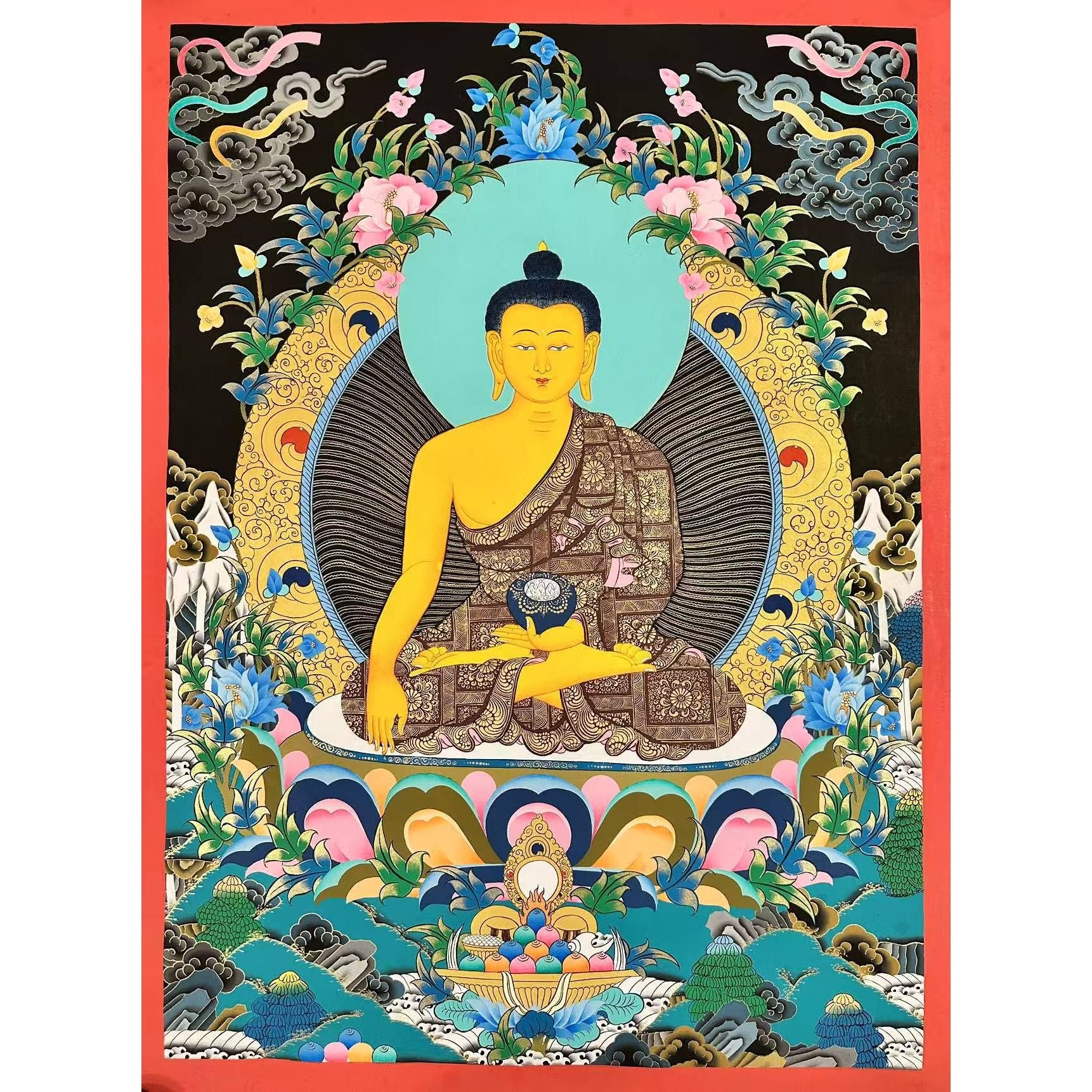 This hand-painted Tibetan Thangka depicting Shakyamuni Buddha is perfect for enhancing various home décor ideas. Crafted with 100% hand-drawn details in the Kathmandu Valley of Nepal, this Thangka can serve as an elegant and striking centerpiece in your home or office. It is also ideal for placement on your family altar for meditation and spiritual healing, attracting the benevolent energy of Tibetan Buddhist art.