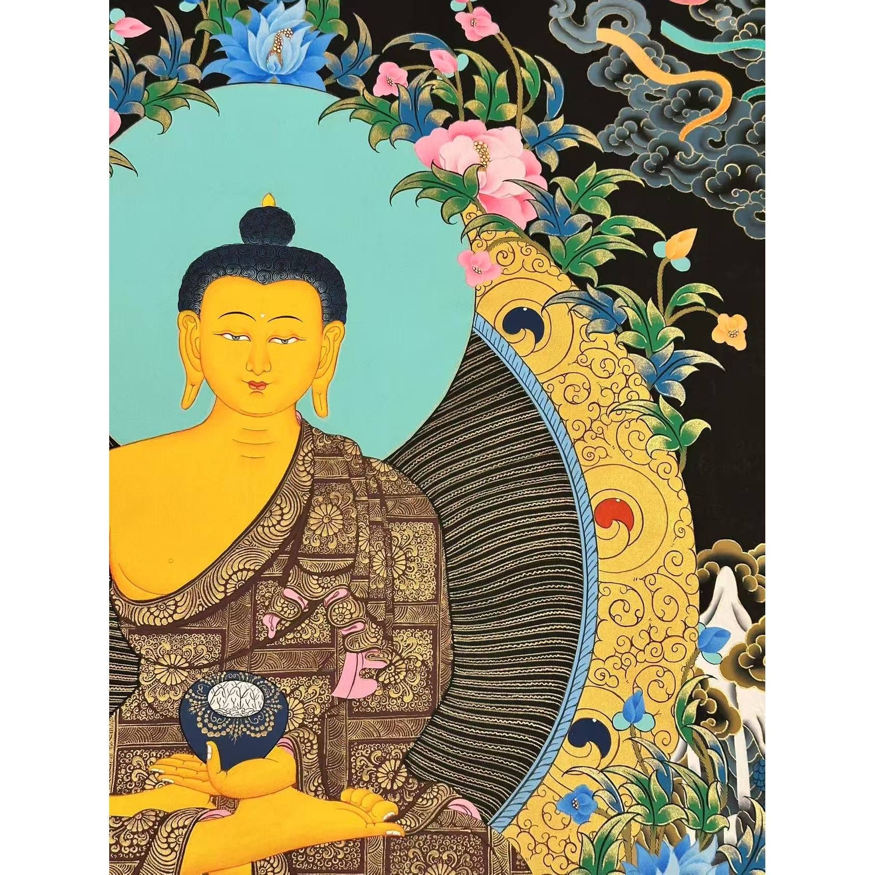 Shakyamuni Buddha, the historical Buddha, is considered the founder of Buddhist philosophy and is often referred to simply as "the Buddha." He is believed to have lived around 420 BC, spending much of his life spreading the teachings of Dharma. In Buddhism, each "kalpa" (a Buddhist eon) has its own Buddha whose teachings, over time, are forgotten before the next Buddha arrives. Shakyamuni’s life is richly detailed in the Thangka known as Life of Buddha, which portrays his journey to enlightenment.