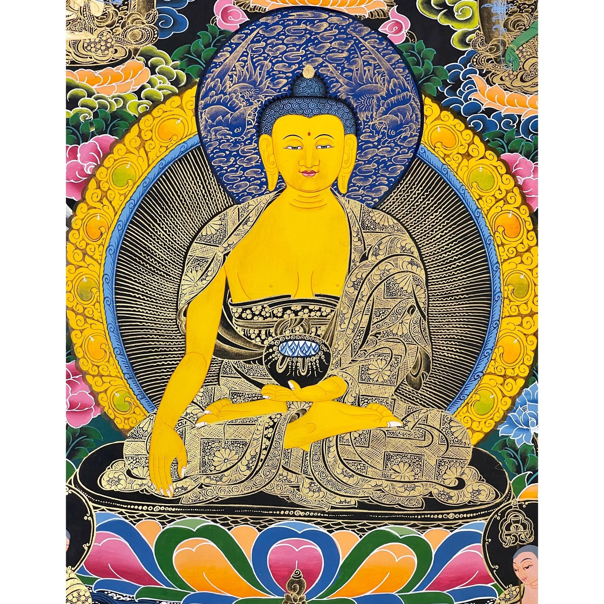 Shakyamuni Buddha, the historical Buddha, is considered the founder of Buddhist philosophy and is often referred to simply as "the Buddha." He is believed to have lived around 420 BC, spending much of his life spreading the teachings of Dharma. In Buddhism, each "kalpa" (a Buddhist eon) has its own Buddha whose teachings, over time, are forgotten before the next Buddha arrives. Shakyamuni’s life is richly detailed in the Thangka known as Life of Buddha, which portrays his journey to enlightenment.
