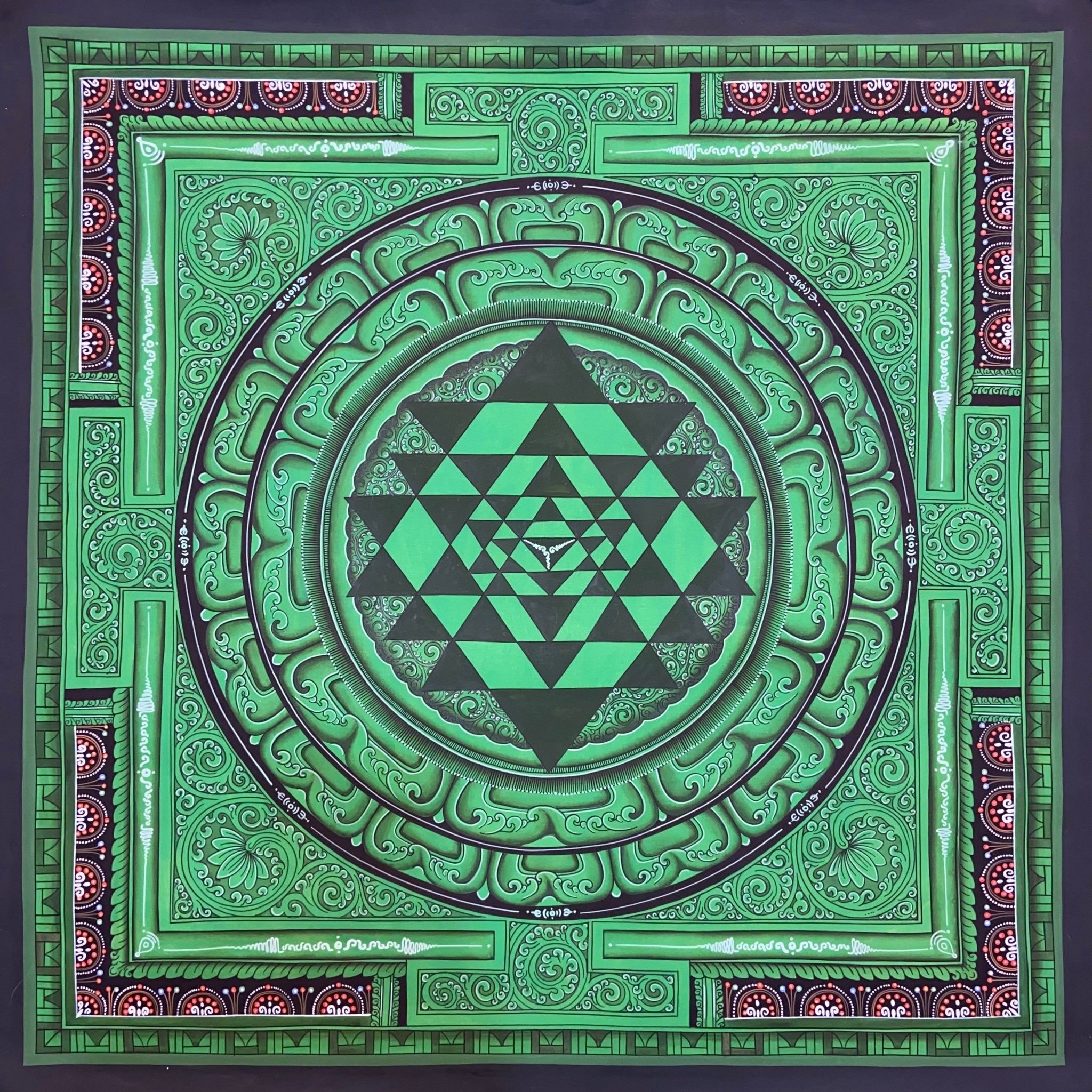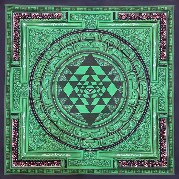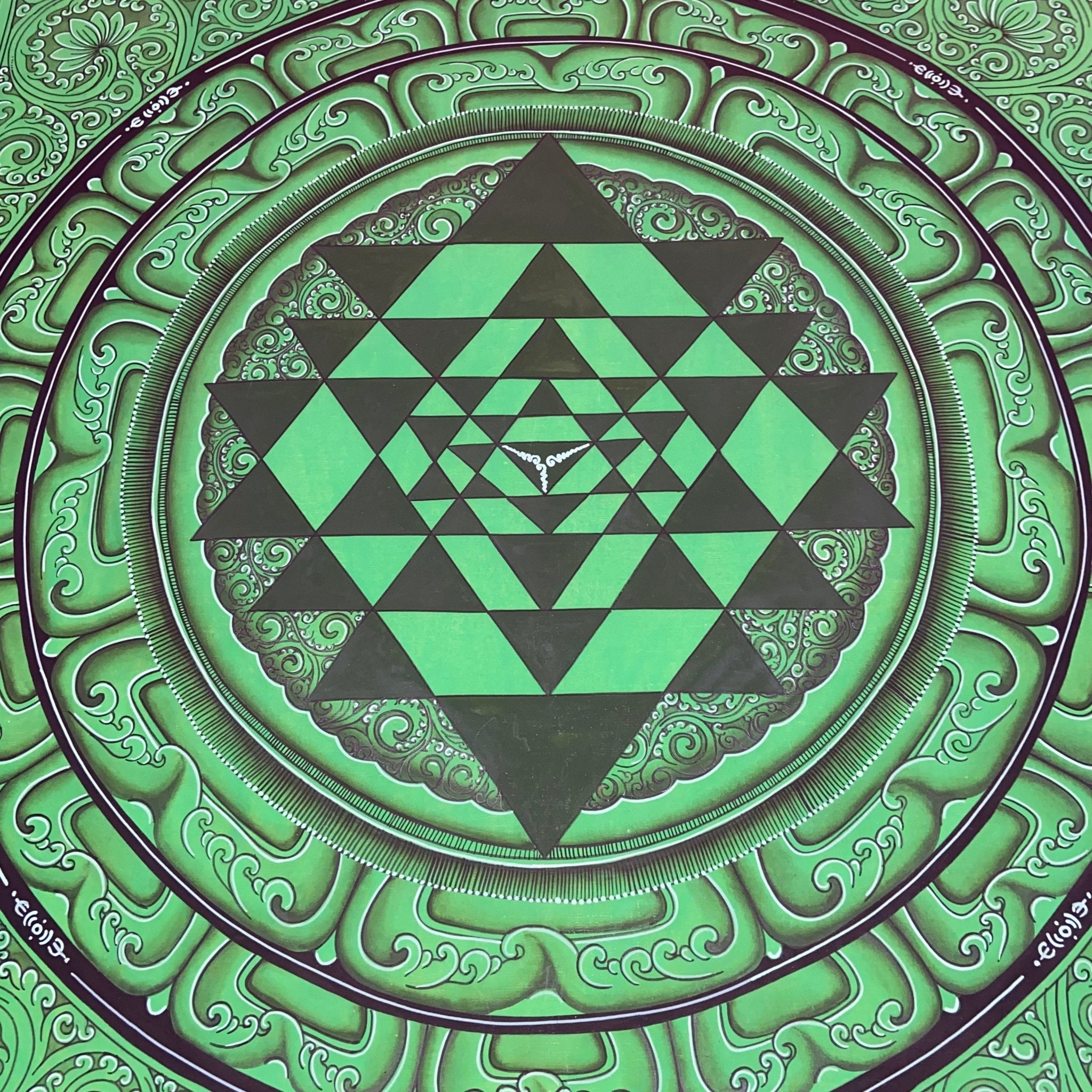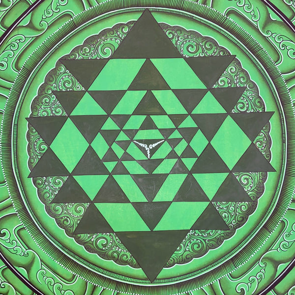 This 100% hand-drawn Tibetan Thangka depicting the Shree Yantra Mandala is perfect for enhancing various home décor ideas. Made in Kathmandu Valley, Nepal, this Thangka can serve as an elegant and captivating centerpiece in your home or office. It can also be placed on your family altar for meditation and spiritual healing, attracting the benevolent energy of Tibetan Buddhist art.