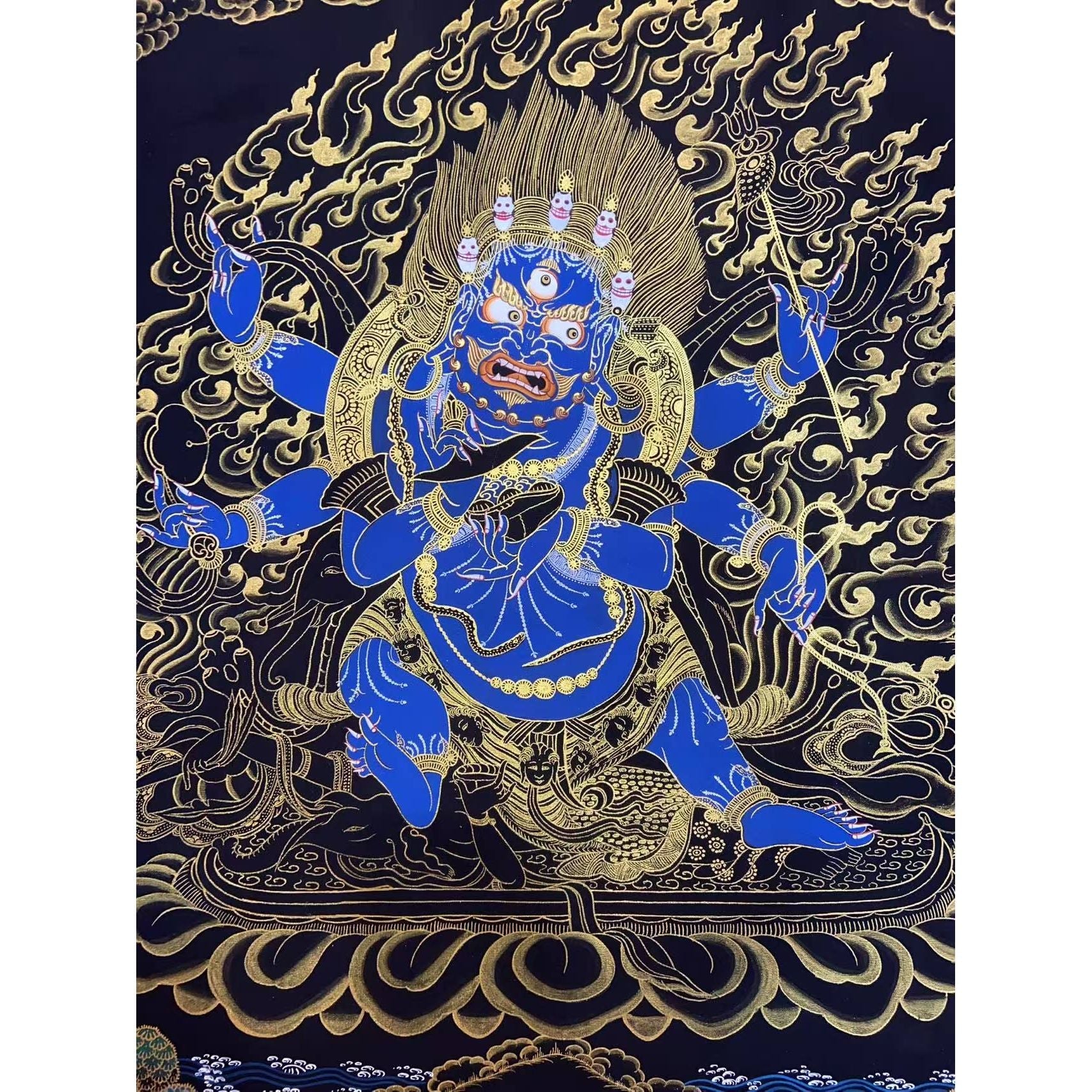 Mahakala, meaning "Great Time" in Sanskrit, is a central figure in Vajrayana Buddhism and is also venerated in Chinese and Japanese Buddhism. Known as Daheitian in Chinese and Daikokuten in Japanese, Mahakala is one of the most revered Dharmapalas. His role is to protect the Dharma and safeguard the teachings of the Buddha.