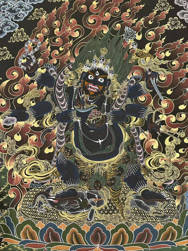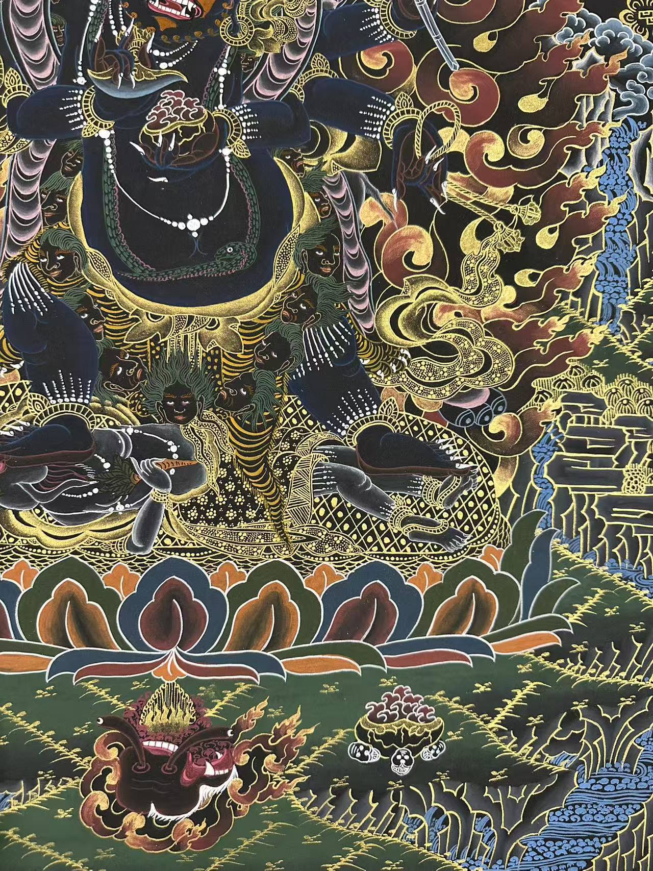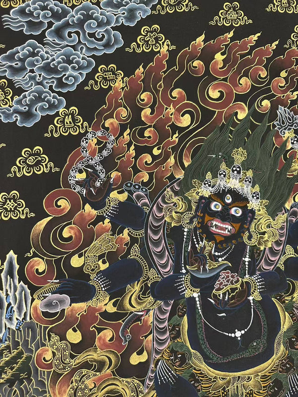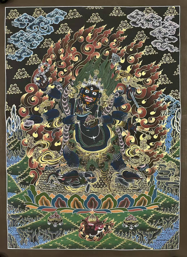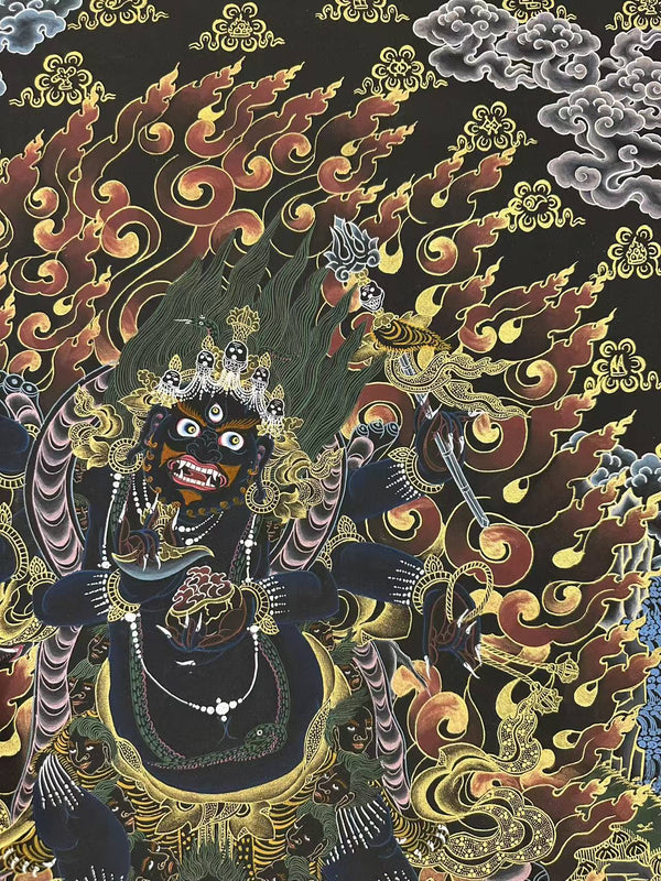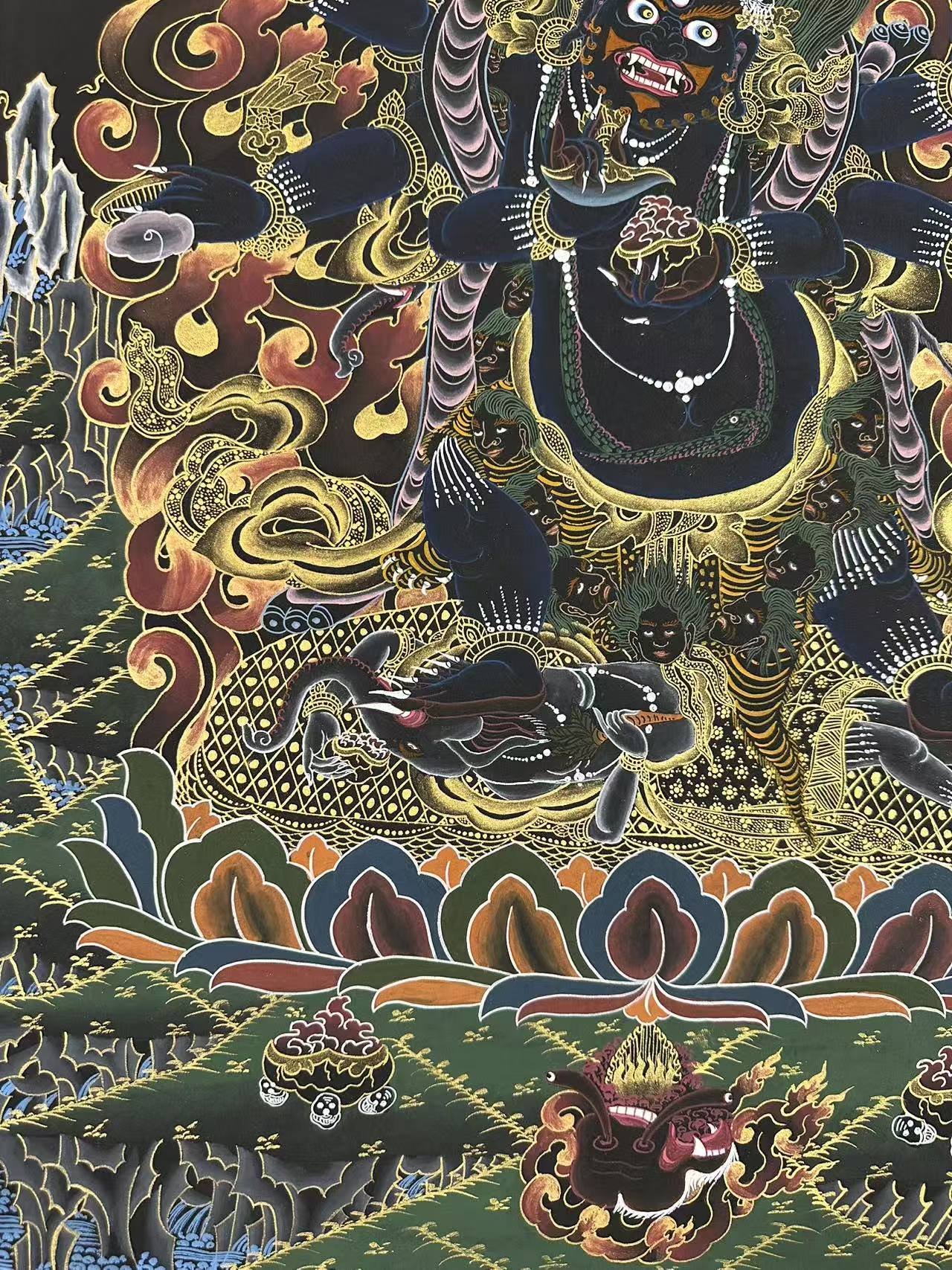 Mahakala, meaning "Great Time" in Sanskrit, is a central figure in Vajrayana Buddhism and is also venerated in Chinese and Japanese Buddhism. Known as Daheitian in Chinese and Daikokuten in Japanese, Mahakala is one of the most revered Dharmapalas. His role is to protect the Dharma and safeguard the teachings of the Buddha.