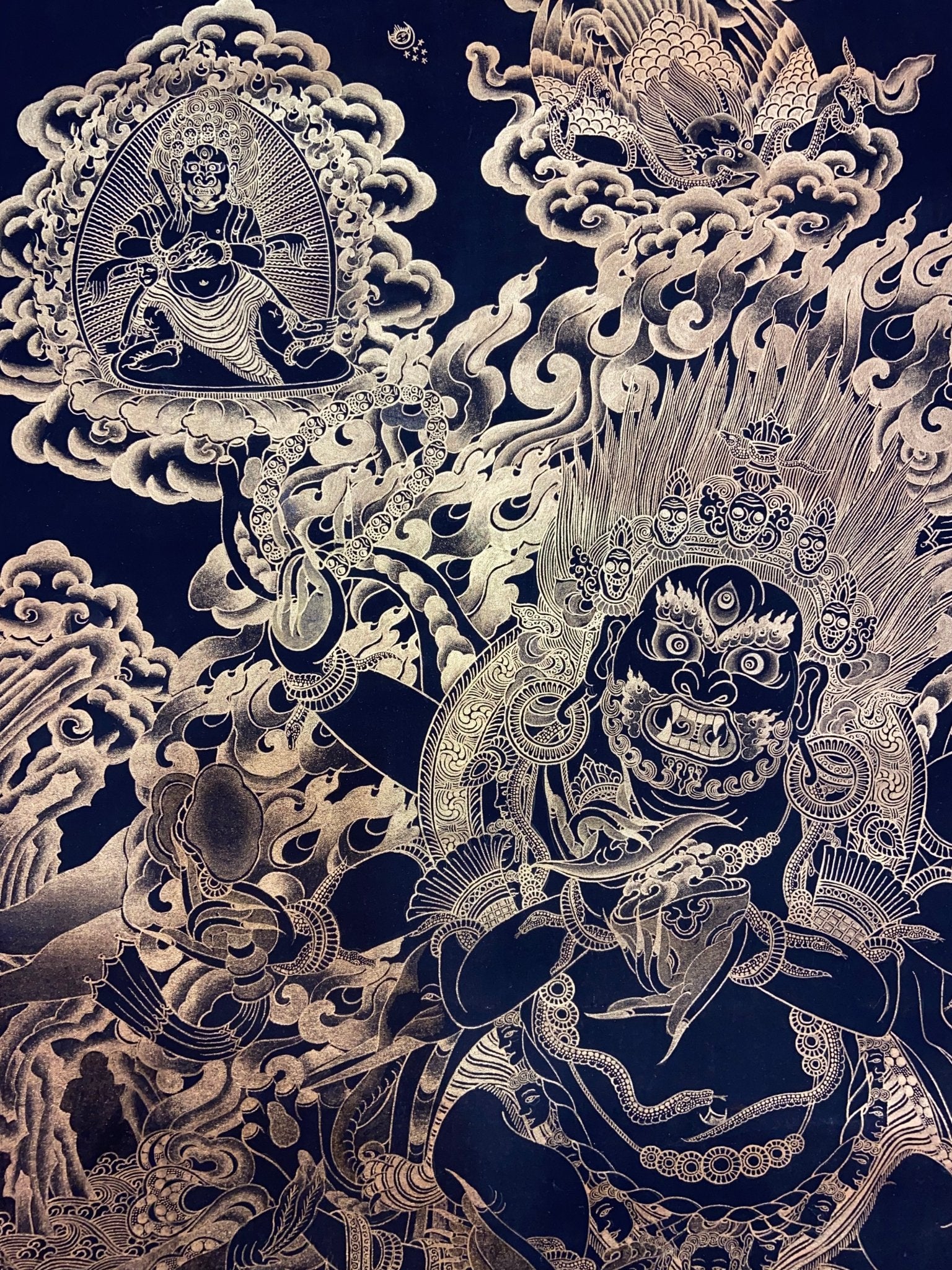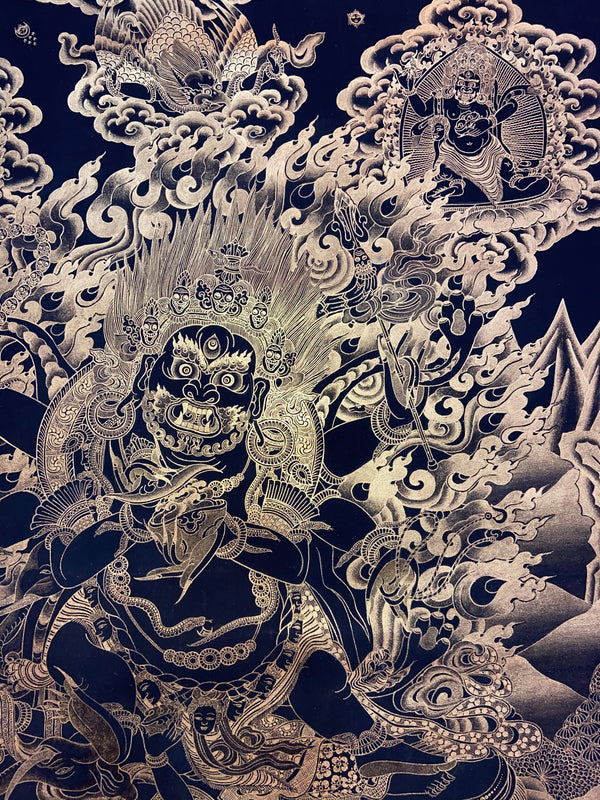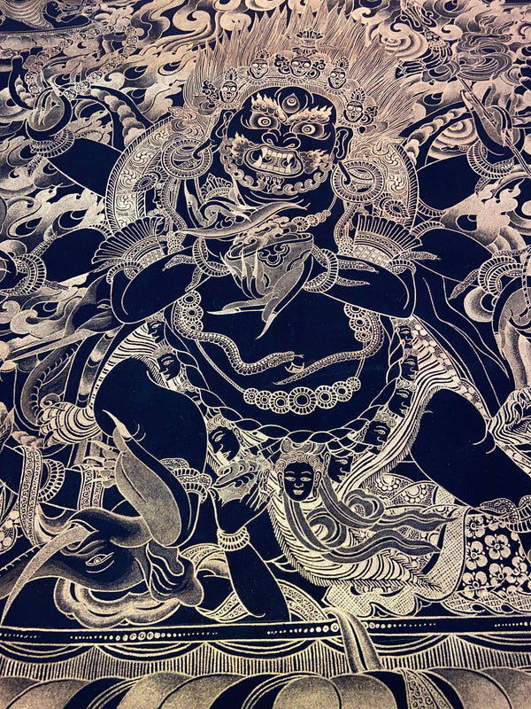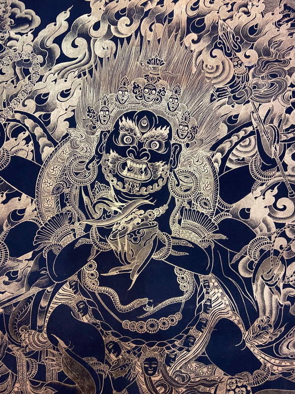 Mahakala, meaning "Great Time" in Sanskrit, is a central figure in Vajrayana Buddhism and is also venerated in Chinese and Japanese Buddhism. Known as Daheitian in Chinese and Daikokuten in Japanese, Mahakala is one of the most revered Dharmapalas. His role is to protect the Dharma and safeguard the teachings of the Buddha.