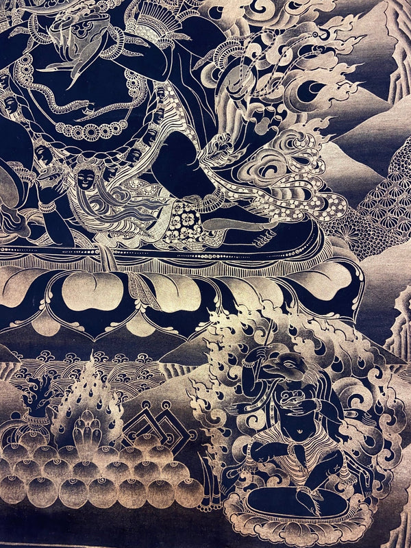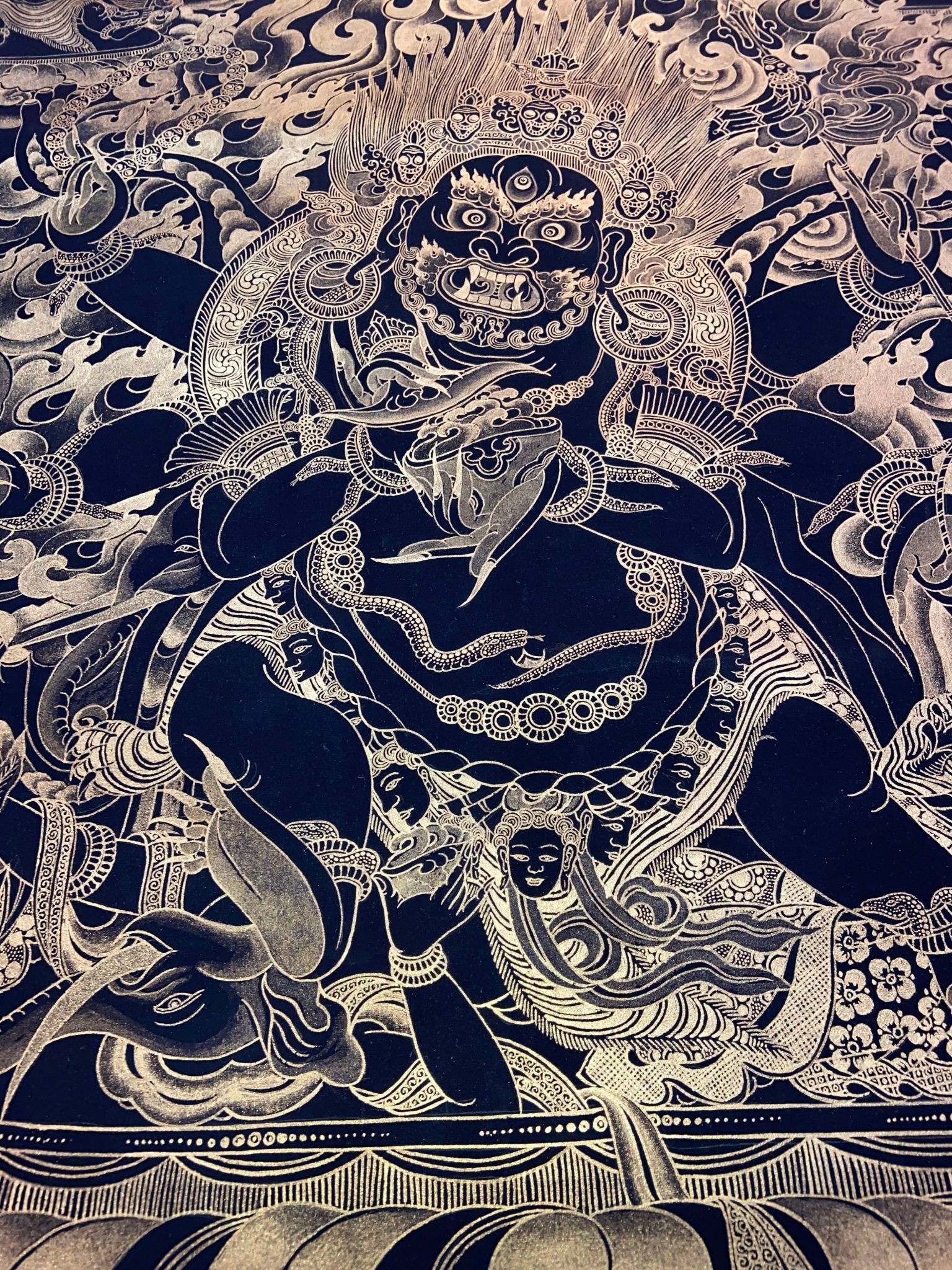 Mahakala is traditionally depicted as black, symbolizing his all-encompassing nature. The color black represents the absorption and dissolution of all colors and forms, signifying the nirguna (ultimate reality) – beyond all qualities and forms. This concept underlines Mahakala’s transcendental and comprehensive power.