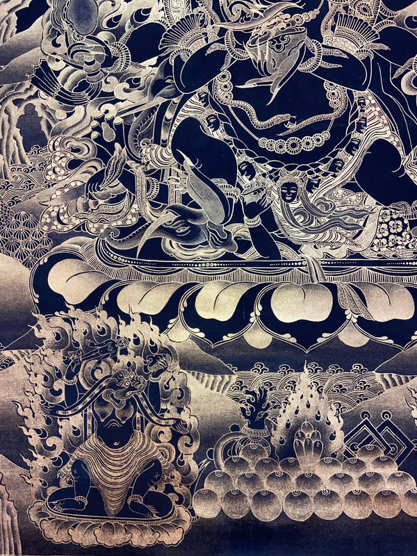 Transformative Power: His crown of skulls symbolizes the transformation of negative afflictions into wisdom.