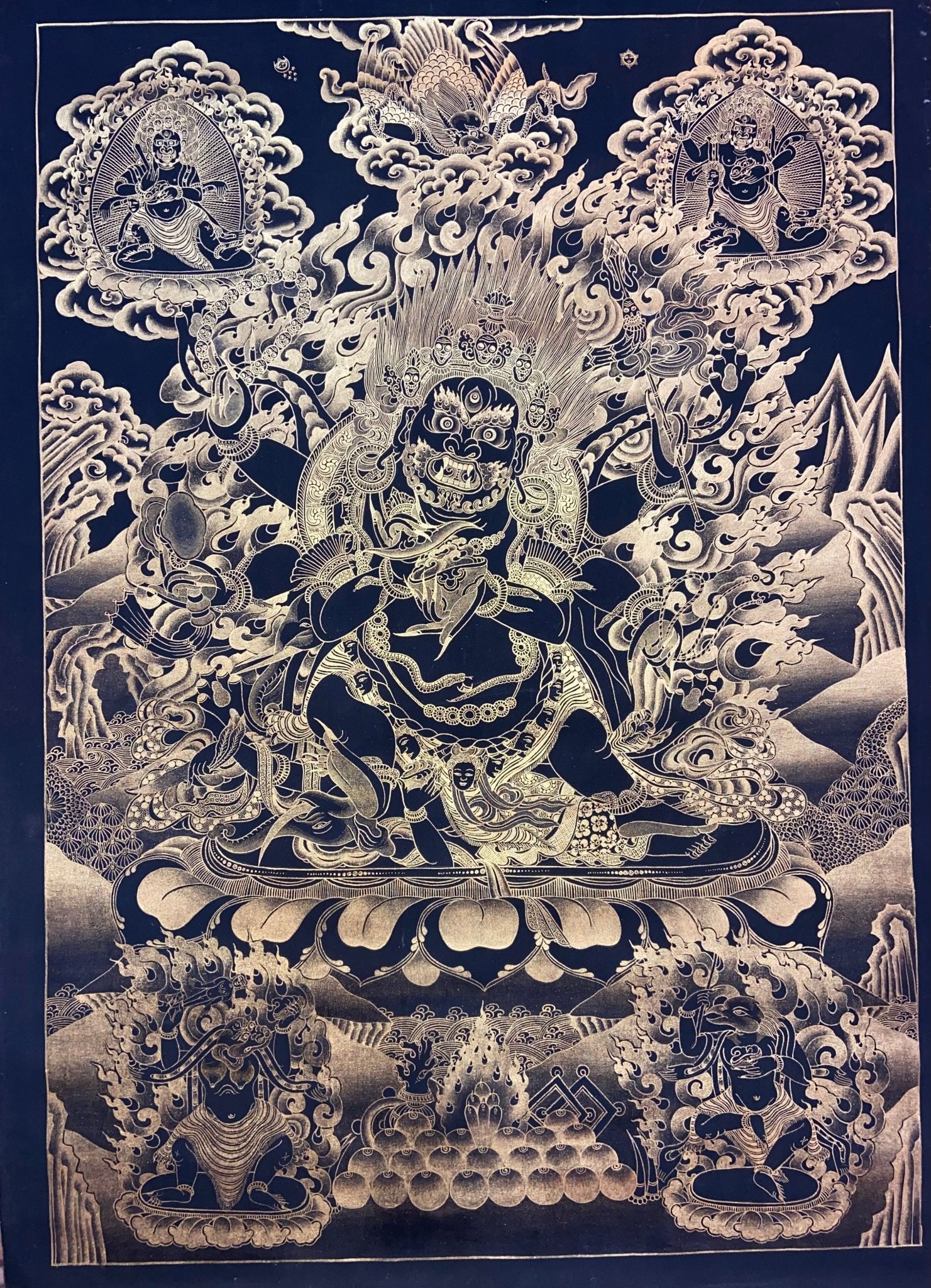 This 100% hand-drawn Thangka, crafted in the Kathmandu Valley, Nepal, is a profound depiction of Mahakala, the powerful Dharmapala (protector of the Dharma) in Vajrayana Buddhism. Ideal for home décor or as a centerpiece in your office, this captivating work of art can also be displayed on your family altar, enhancing your spiritual practices and inviting emotional healing. The Thangka brings forth the benevolent energy of Tibetan Buddhist art, enriching your environment with peace and protection.