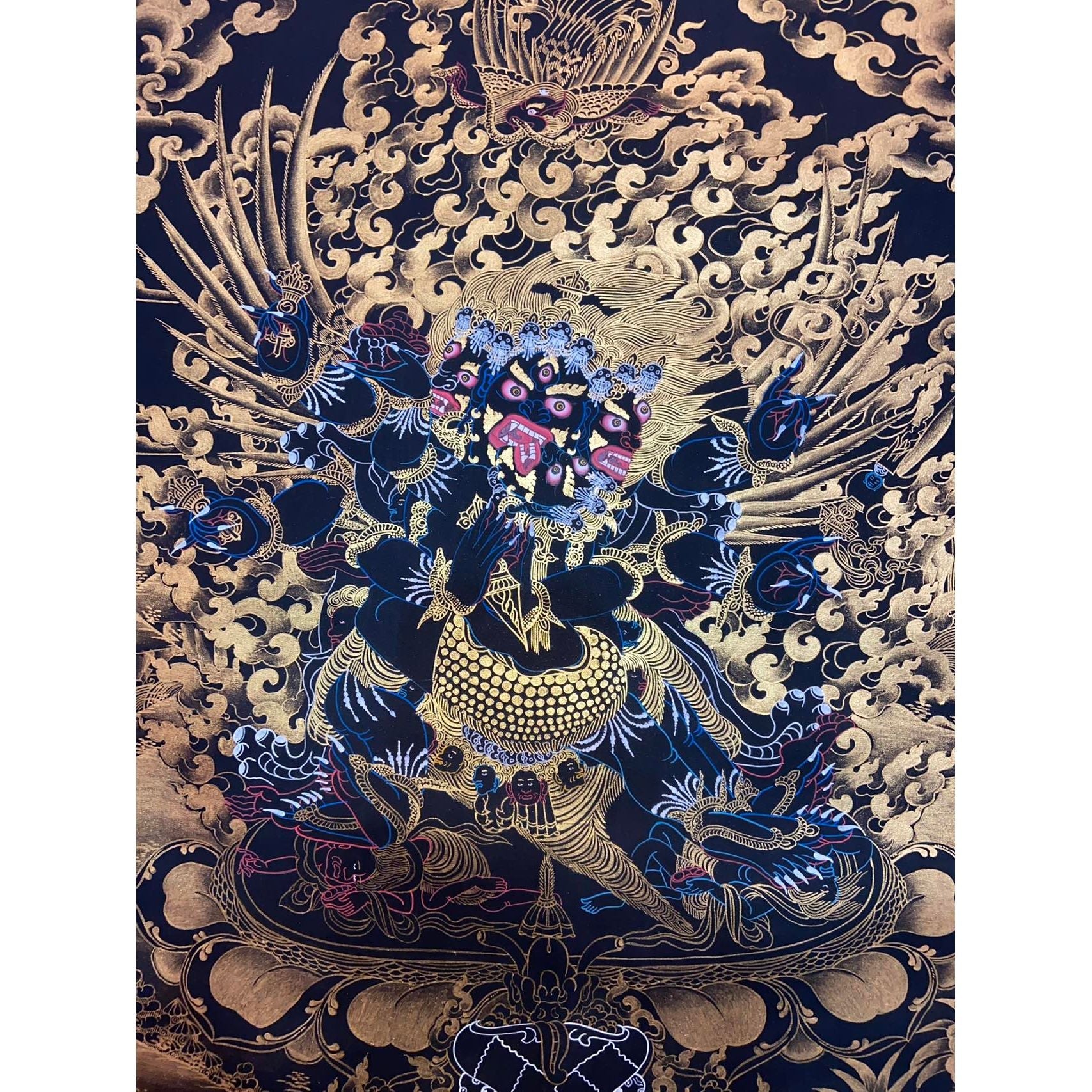 Tibetan Thangka painting depictingVajrakilaya is perfect for various home décor ideas! This 100% hand-drawn Thangka painting made in Kathmandu Valley, Nepal can be decorated as an elegant and eccentric wall hanging in your home or office being a centrepiece of attention. It can also be placed on your family altar for meditation purposes as well as spiritual and emotional healing, attracting benevolent energy of the Tibetan Buddhist art.