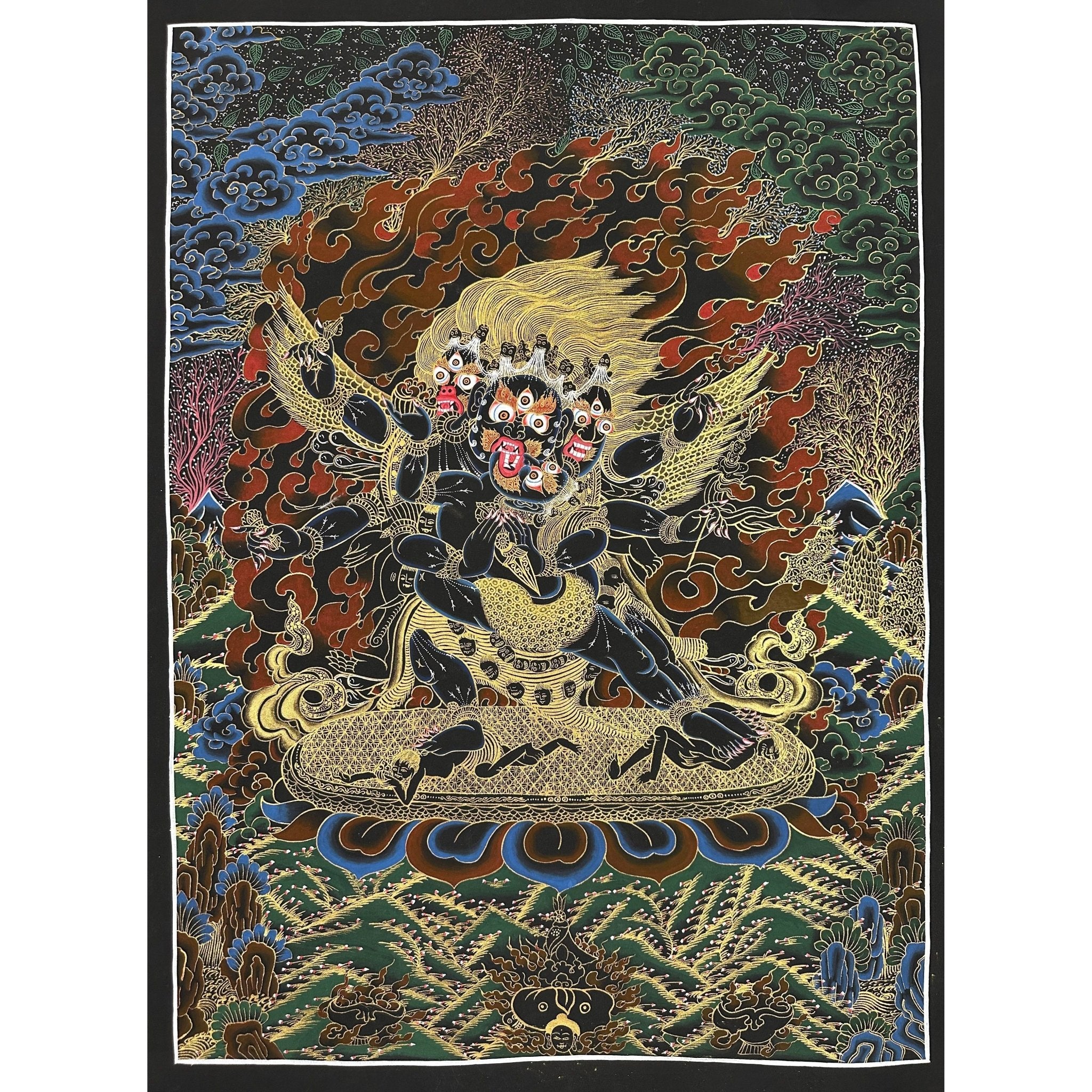 In this thangka, Vajrakilaya is depicted with three faces, representing his comprehensive nature. His crown of skulls signifies his mastery over the ego and the transformation of ignorance into wisdom. The wrathful expression of Vajrakilaya underscores his power to eliminate obstacles and purify the mind.