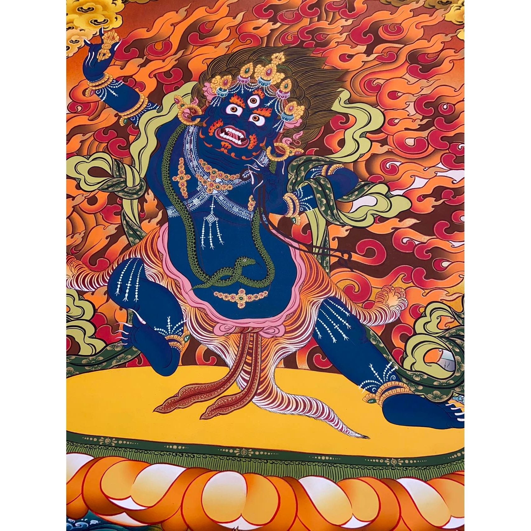The dark blue hue of Vajrapani reflects his eternal connection to the Truth Body (Dharmakaya), representing the ultimate blissful state of enlightenment. Despite his wrathful appearance, his purpose is compassionate—protecting the teachings and upholding the Buddha's Dharma from those who wish to destroy it.
