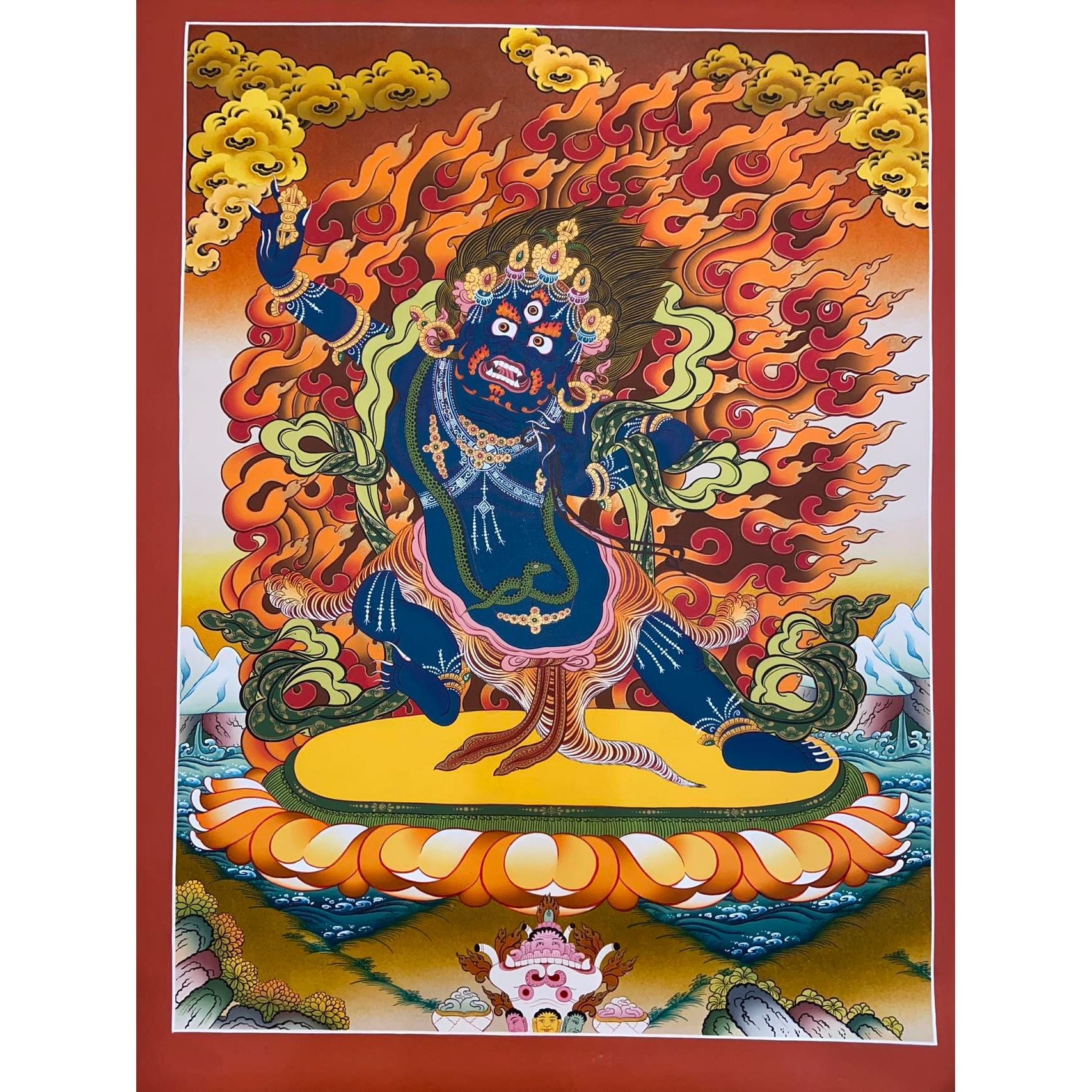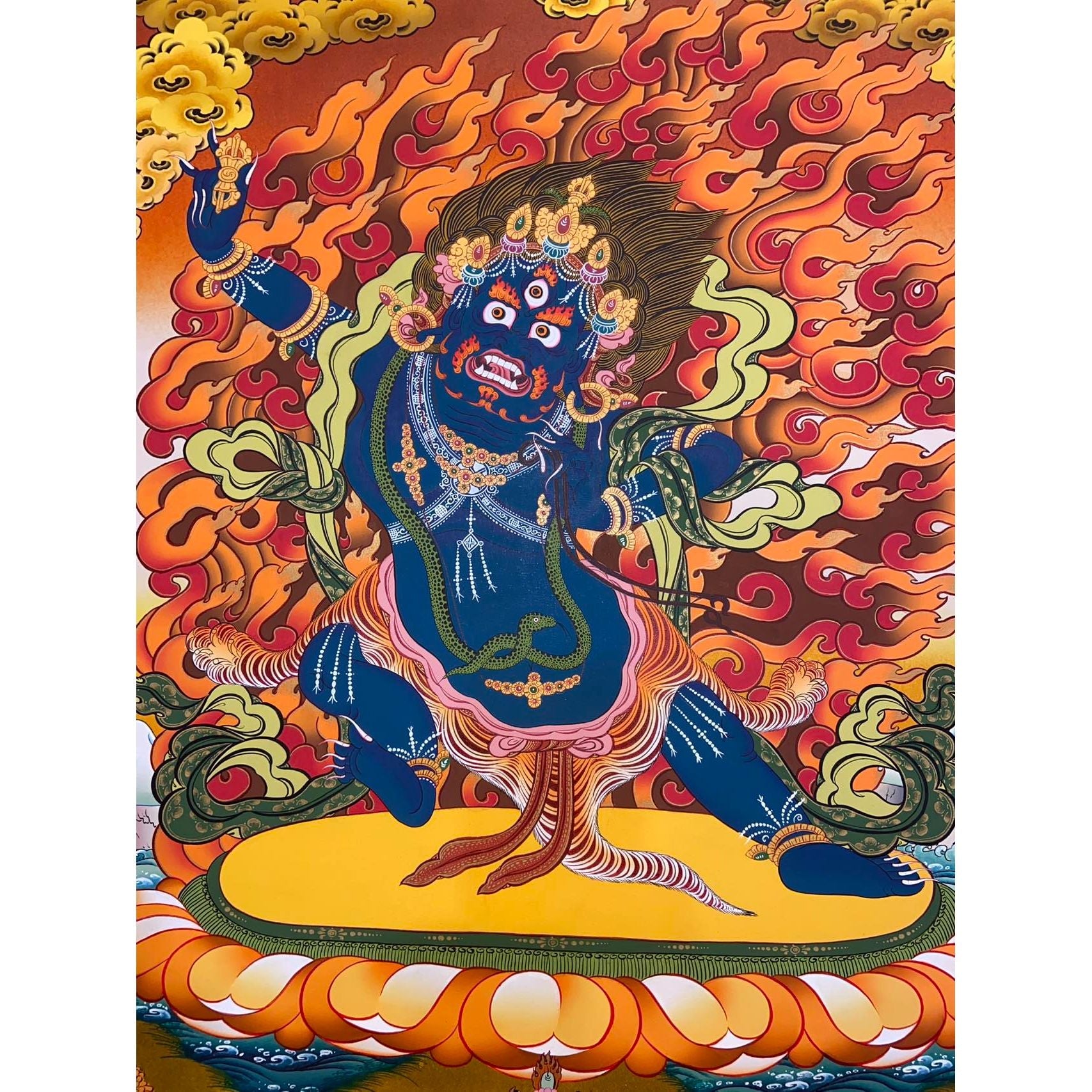 Vajrapani, one of the most revered deities in Tibetan Buddhism, embodies the power and protection of the Dharma (the teachings of Buddha). Known as the Conqueror of the Four Quarters, Vajrapani is a guardian of the tantric teachings of the Buddha and a fierce protector of truth. His mission to vanquish the demon Nagpo Tsalak symbolizes his determination to defeat the forces that threaten the Dharma.