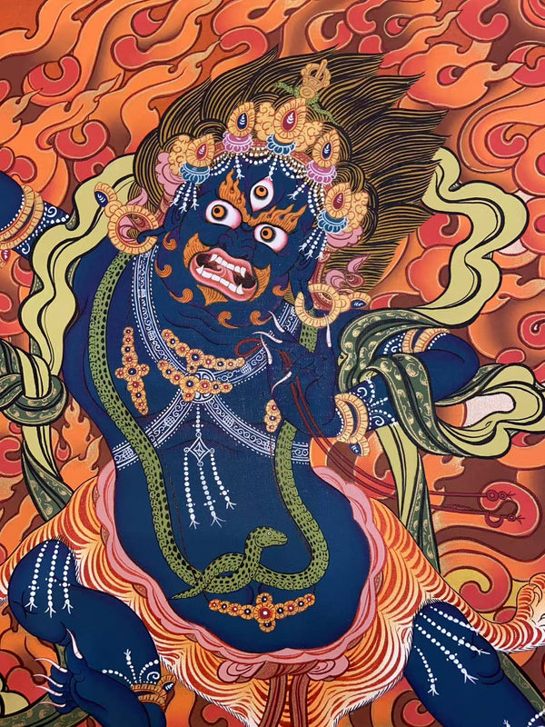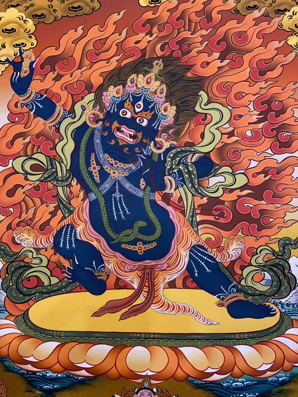 The dark blue hue of Vajrapani reflects his eternal connection to the Truth Body (Dharmakaya), representing the ultimate blissful state of enlightenment. Despite his wrathful appearance, his purpose is compassionate—protecting the teachings and upholding the Buddha's Dharma from those who wish to destroy it.