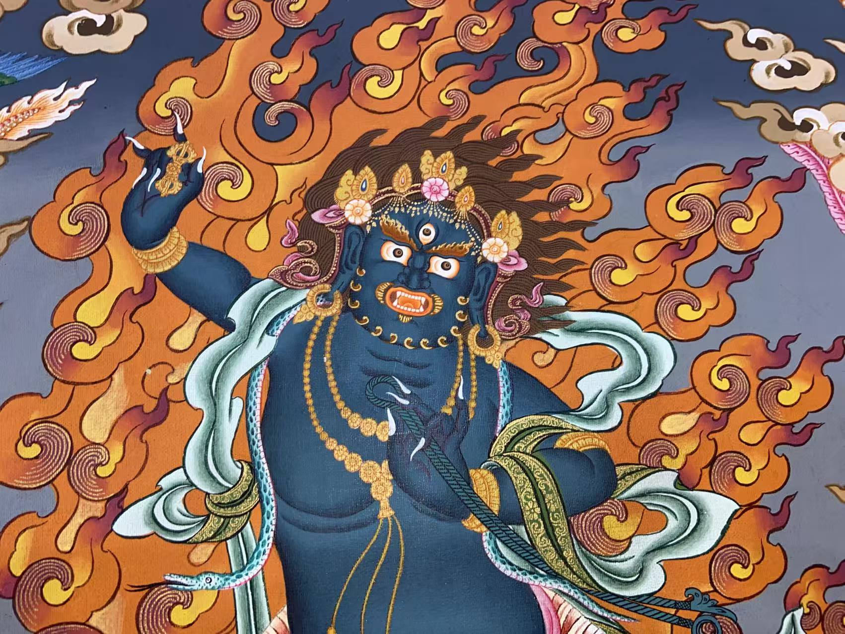 The dark blue hue of Vajrapani reflects his eternal connection to the Truth Body (Dharmakaya), representing the ultimate blissful state of enlightenment. Despite his wrathful appearance, his purpose is compassionate—protecting the teachings and upholding the Buddha's Dharma from those who wish to destroy it.