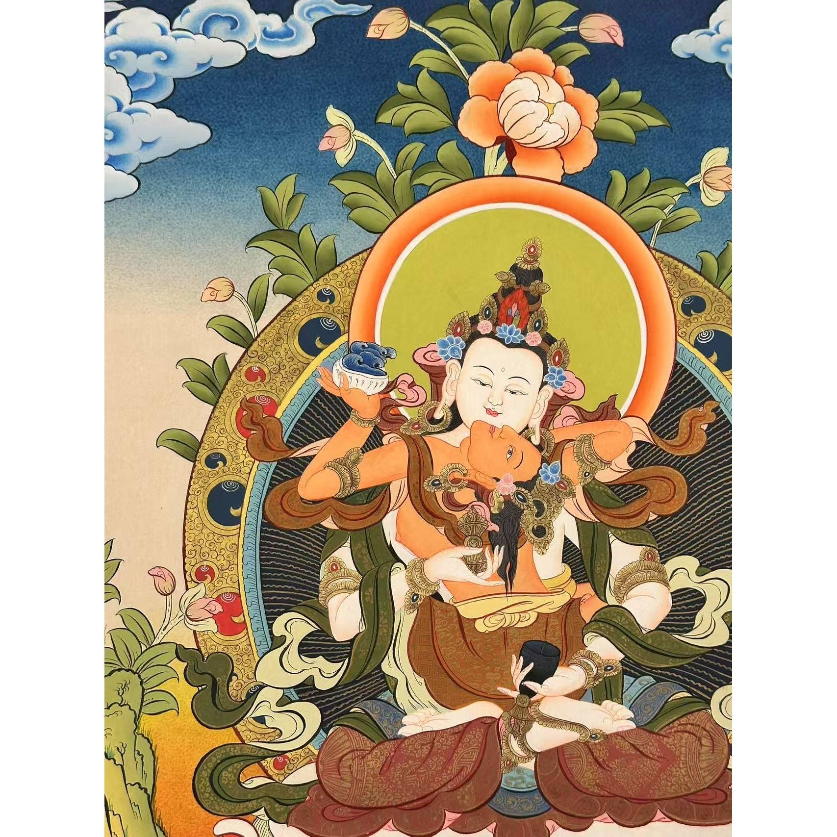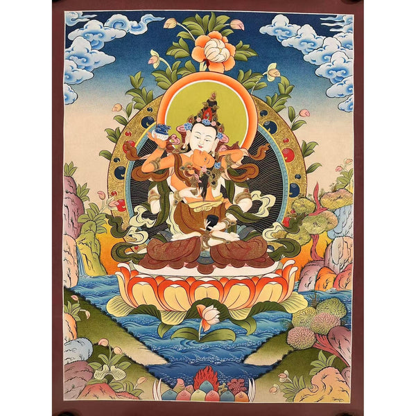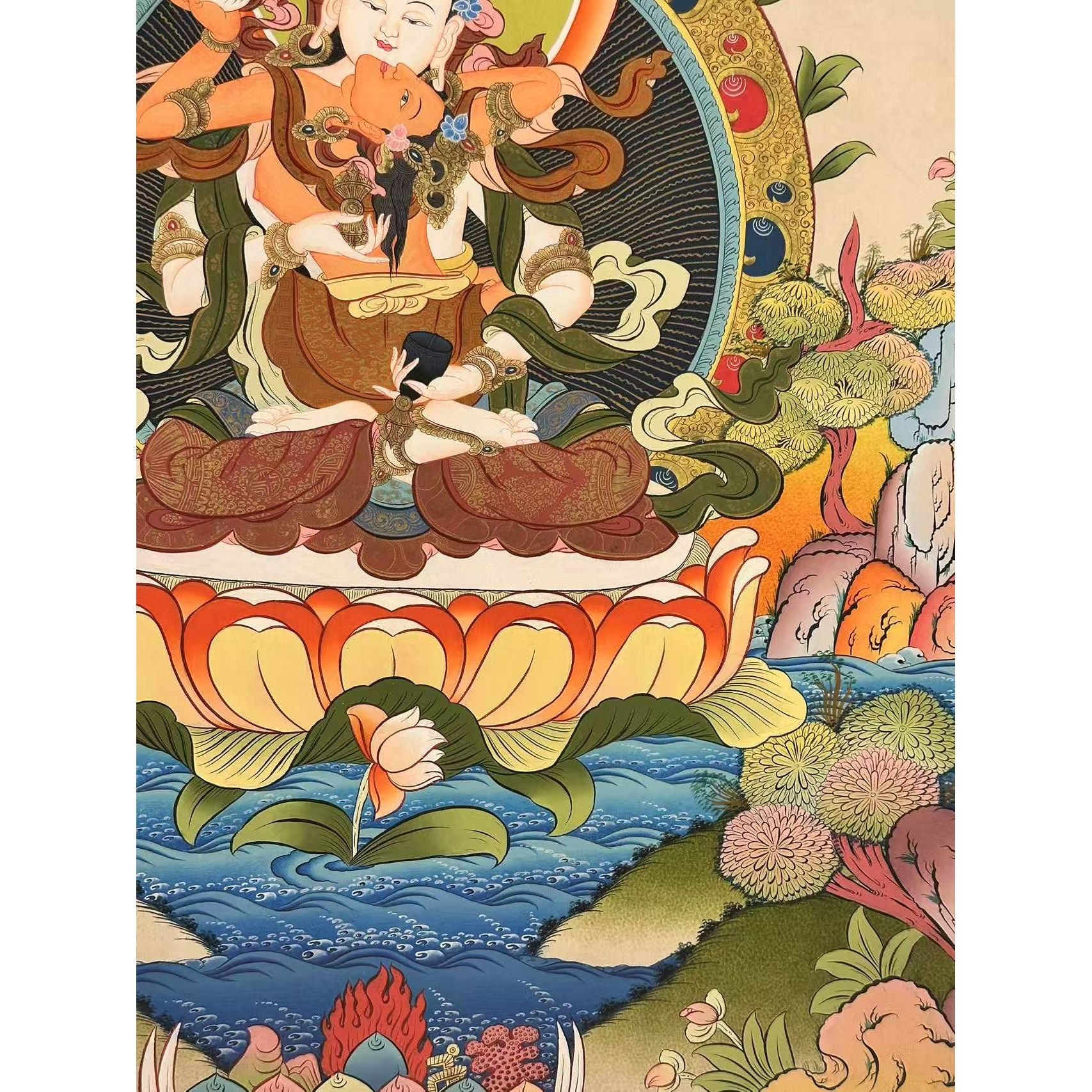 In this Thangka, Vajrasattva is portrayed alongside his consort. A purification-focused meditational Bodhisattva deity, he is revered by Vajrayana Buddhists across all sects. According to ancient scriptures, repenting to Vajrasattva and chanting his hundred-syllable mantra can cleanse one of all sins and obscurations, making this Thangka a powerful tool for purification.