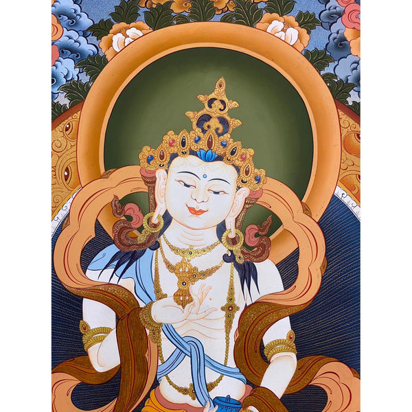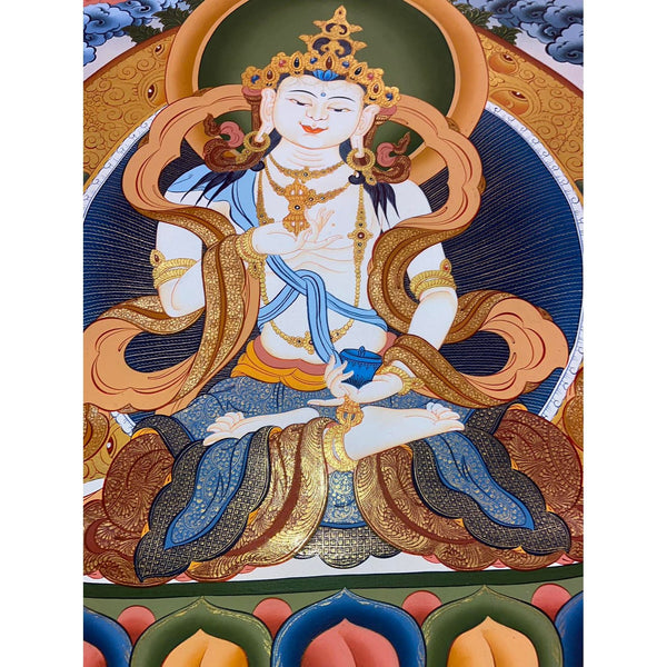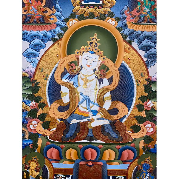 In this Thangka, Vajrasattva holds a vajra in his right hand and a bell in his left hand. The vajra represents Reality and Compassion, while the bell symbolizes Wisdom. These two attributes work in harmony to guide spiritual practitioners towards enlightenment. Vajrasattva is often invoked for purification of negative actions and obscurations through the powerful recitation of his hundred-syllable mantra.