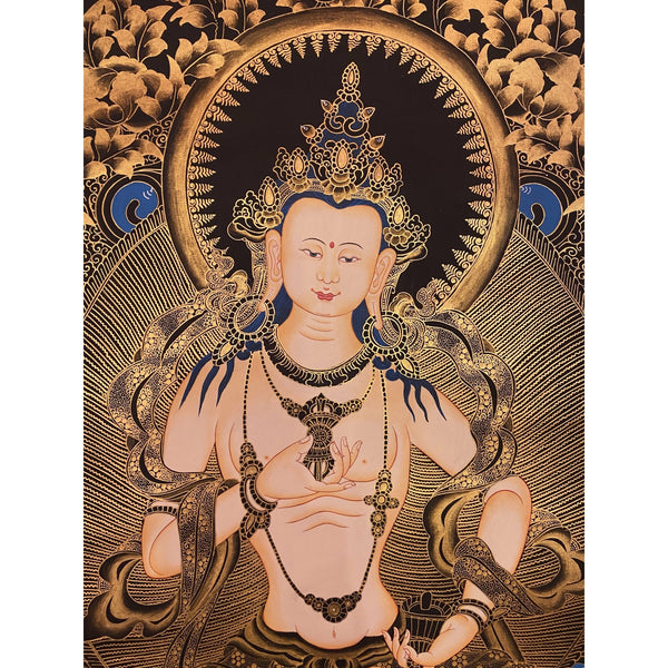 Vajrasattva, also known as the Prince of Purity, is a central figure in Vajrayana Buddhism, embodying the highest form of purity and spiritual transformation. His name, meaning "Adamantine Being," reflects his unshakable essence. Depicted in a serene and youthful form, Vajrasattva wears the silks and jewels of a wealthy prince, symbolizing his noble and pure nature.