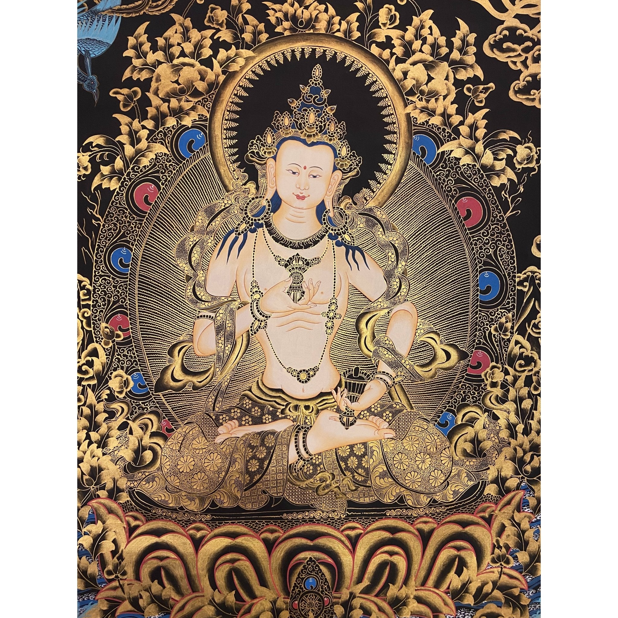 In this Thangka, Vajrasattva holds a vajra in his right hand and a bell in his left hand. The vajra represents Reality and Compassion, while the bell symbolizes Wisdom. These two attributes work in harmony to guide spiritual practitioners towards enlightenment. Vajrasattva is often invoked for purification of negative actions and obscurations through the powerful recitation of his hundred-syllable mantra.