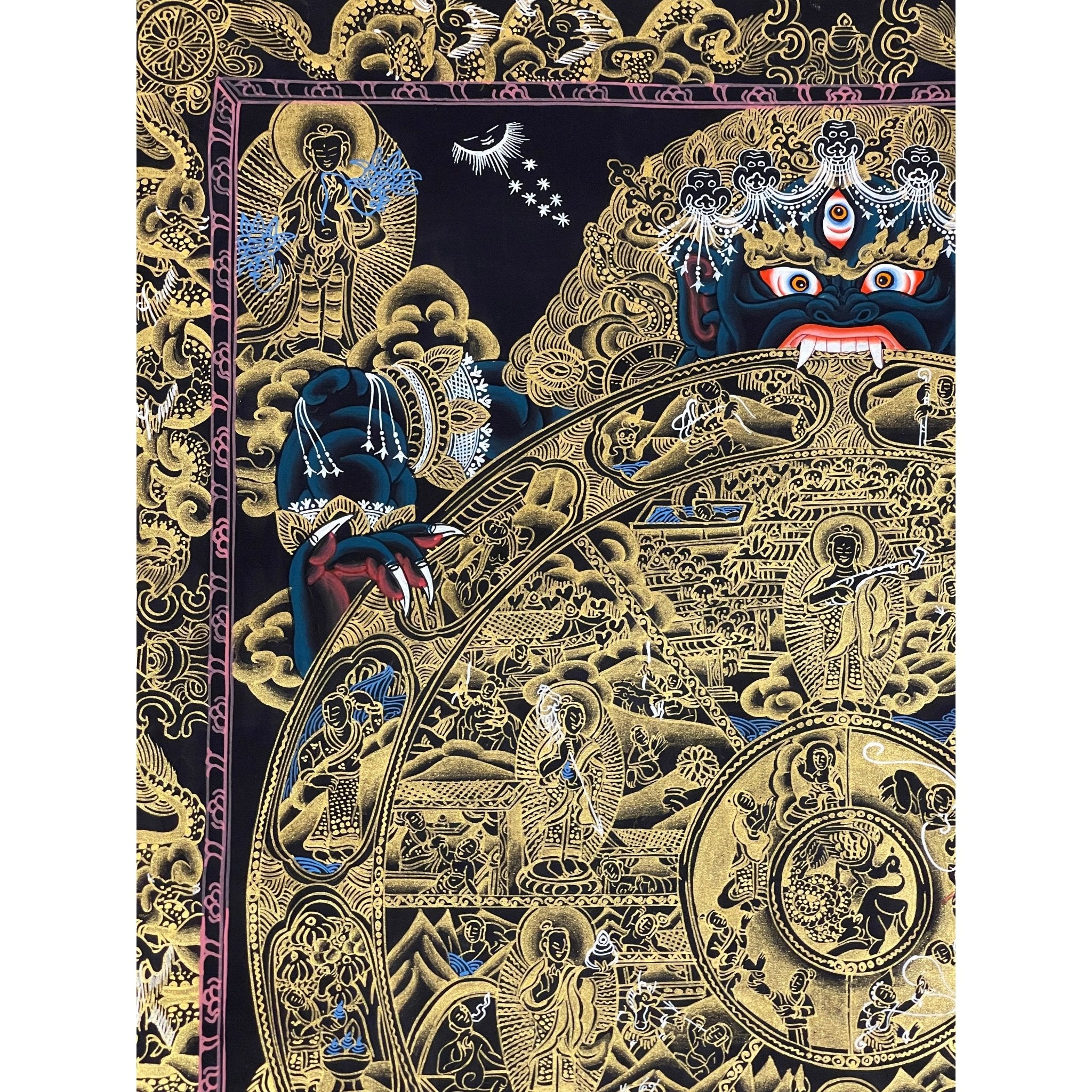 This Tibetan Wheel of Life Thangka is a profound representation of the Buddhist philosophy, perfect for both home décor and meditation spaces. This 100% hand-drawn Thangka painting, created in the Kathmandu Valley of Nepal, embodies the cycle of existence, illustrating the path from suffering to enlightenment. It can serve as a centerpiece in your home or office, or as a powerful tool for spiritual healing and meditation when placed on your family altar. Embrace the benevolent energy of Tibetan Buddhist art and enhance your surroundings with this stunning visual.