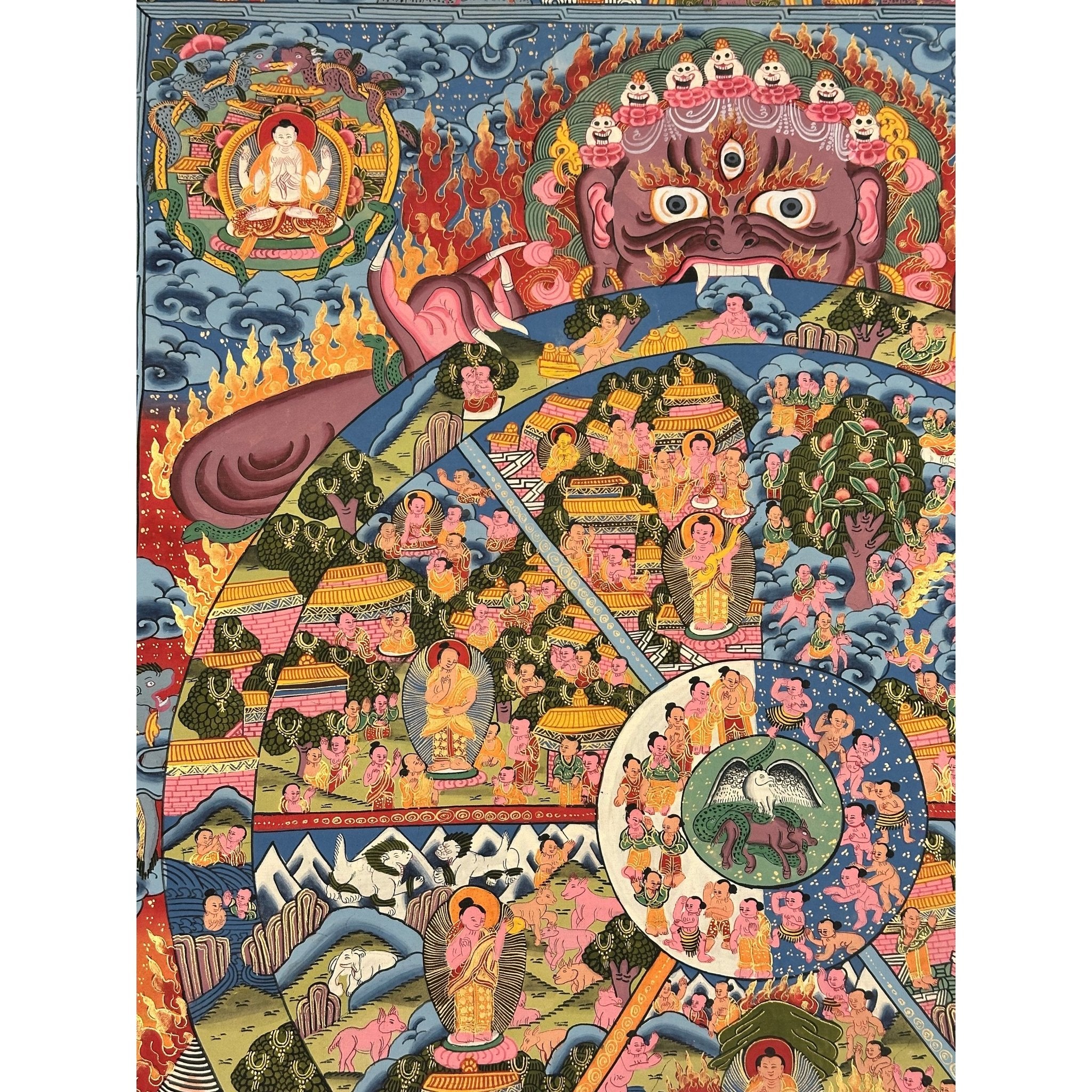 The Wheel of Life Thangka serves not only as a stunning work of art but also as a visual reminder of the impermanence of life and the path to spiritual freedom. It offers wisdom on how to transcend the cycle of suffering and attain Nirvana, the ultimate realization of happiness and liberation.