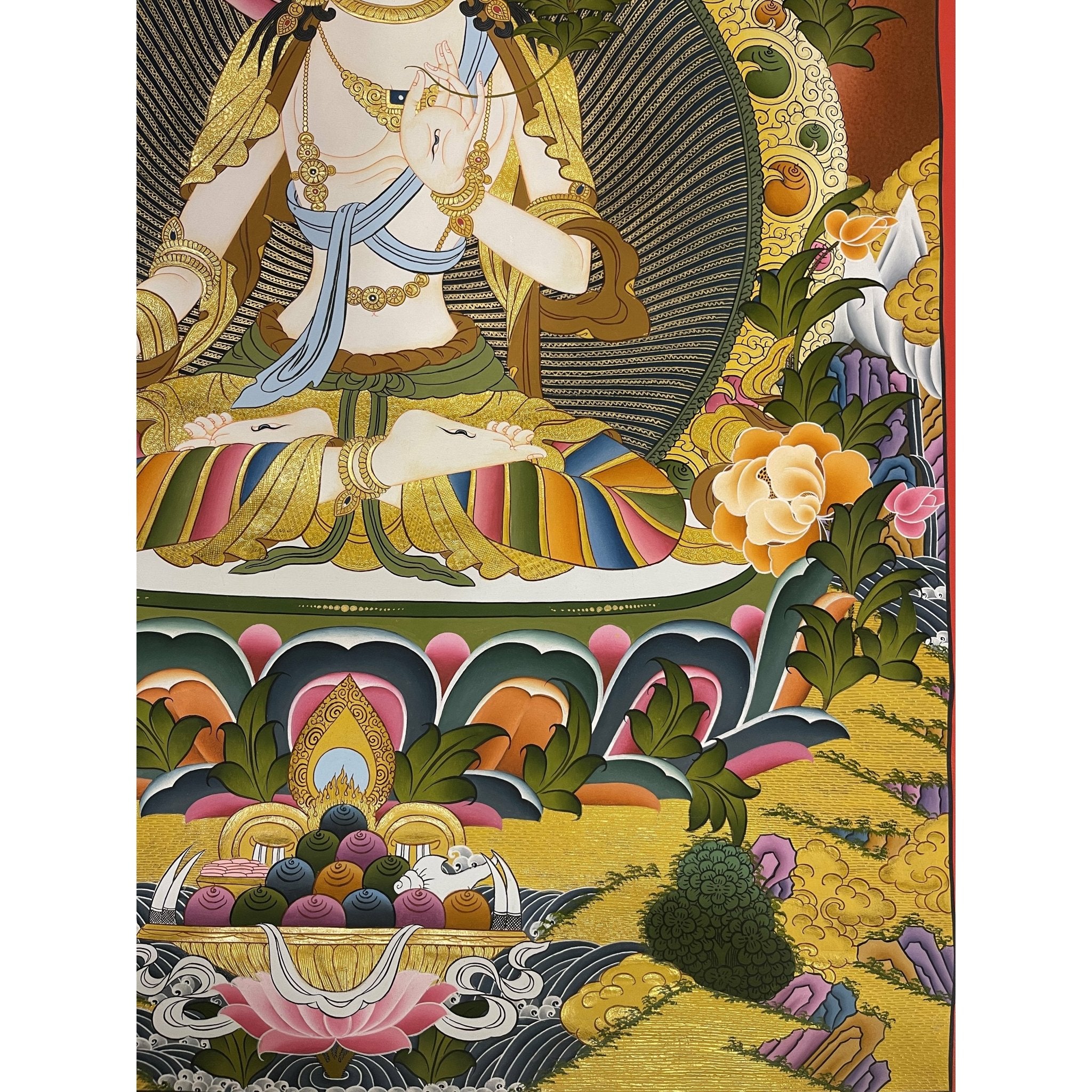 Invite the compassionate and healing energy of White Tara into your space with this exquisite hand-painted Tibetan Thangka. Crafted by skilled artisans in the Kathmandu Valley, Nepal, this sacred artwork is perfect for a variety of home décor styles. It serves as an elegant centerpiece in any room, whether it’s your home, office, or family altar. Ideal for meditation and spiritual healing, this Thangka channels the benevolent energy of White Tara, bringing peace, longevity, and compassion to your environment.