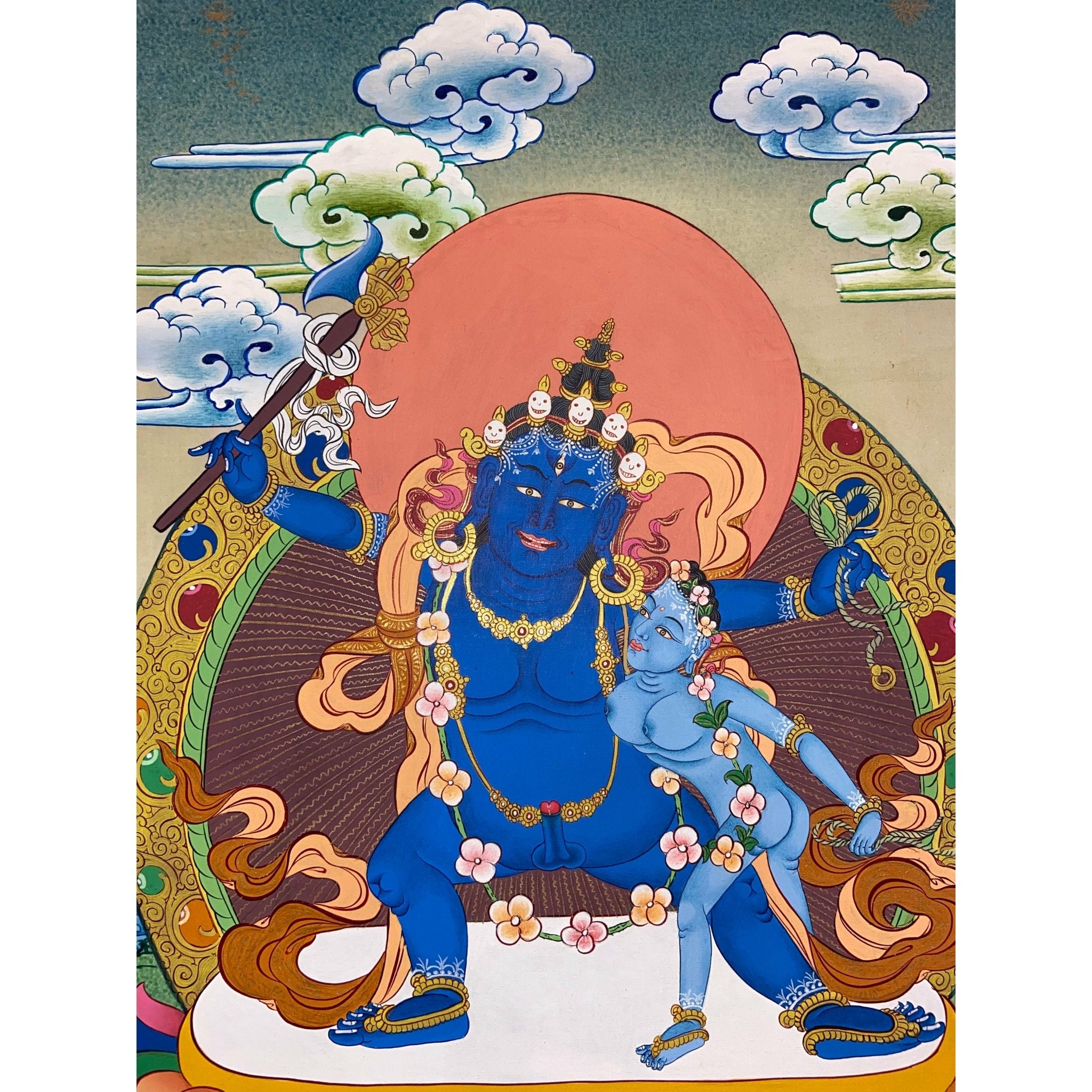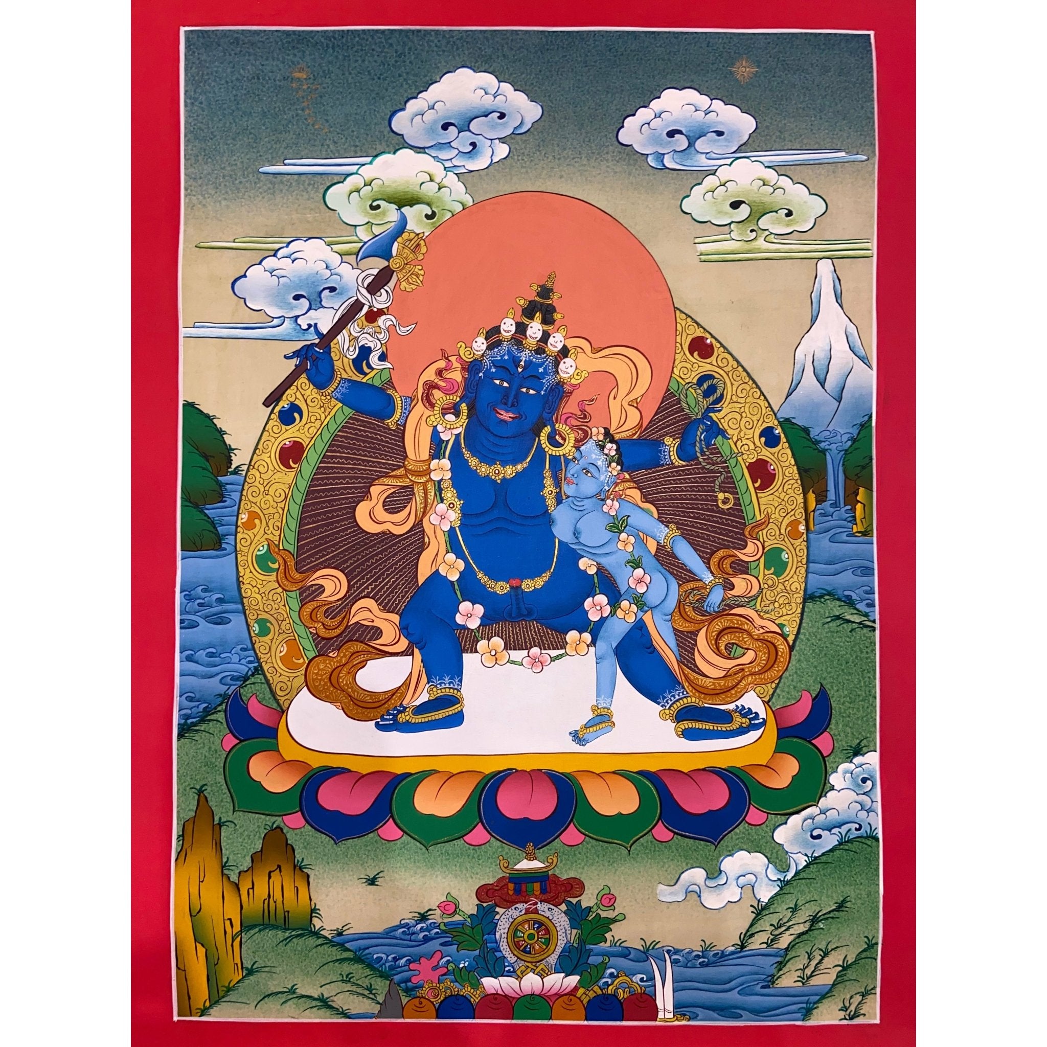 This Tibetan Thangka depicting Yama Dharmaraja is a powerful and striking addition to any home décor. Hand-drawn in the Kathmandu Valley, Nepal, this 100% hand-painted Thangka is perfect for transforming your space, whether as a centerpiece wall hanging in your home or office, or placed on your family altar to attract benevolent energy and support spiritual growth. It is a stunning representation of Tibetan Buddhist art, bringing emotional healing, meditative focus, and a sense of divine protection into your life.