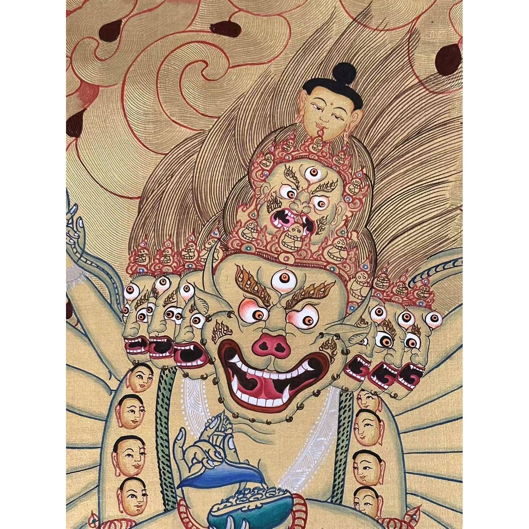 This stunning Tibetan Thangka painting of Yamantaka, hand-drawn in the Kathmandu Valley, Nepal, is an exquisite work of art that embodies profound spiritual energy. Perfect as a centerpiece for home décor, it adds a bold and elegant touch to your living space or office. It can also be placed on a family altar for meditation and spiritual practices, helping to channel the benevolent energy of Tibetan Buddhist art for emotional and spiritual healing.