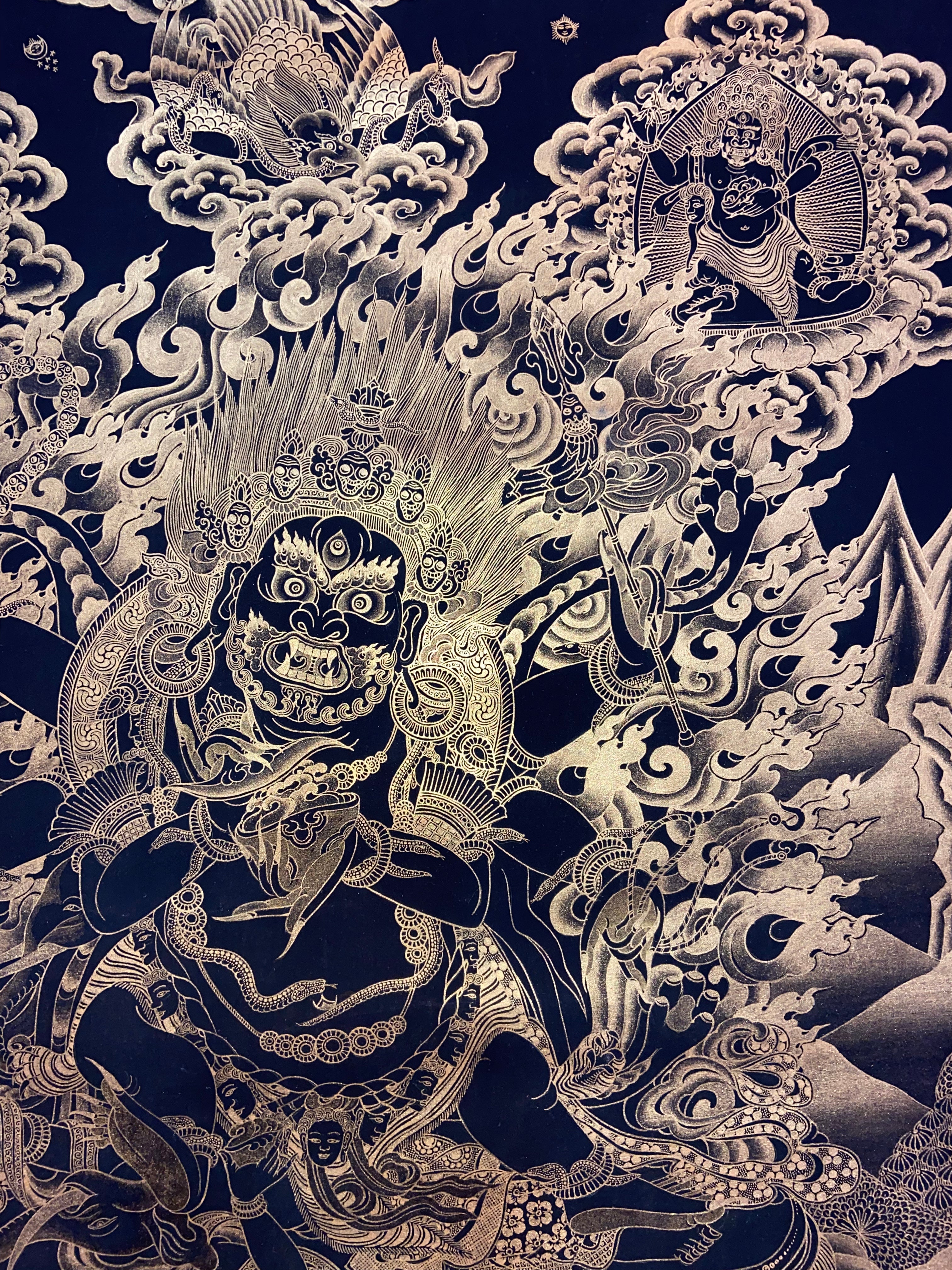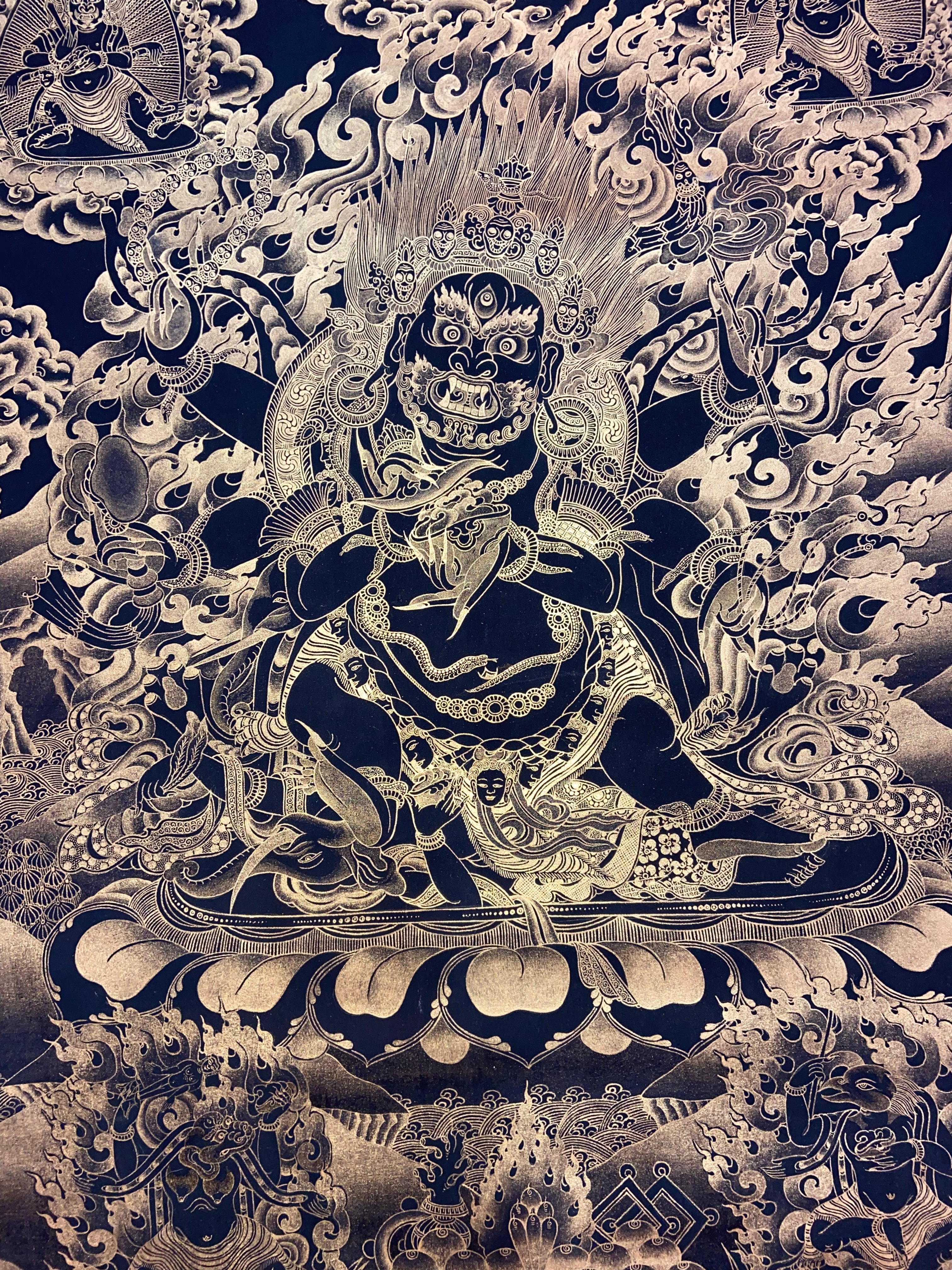 Mahakala, meaning "Great Time" in Sanskrit, is a central figure in Vajrayana Buddhism and is also venerated in Chinese and Japanese Buddhism. Known as Daheitian in Chinese and Daikokuten in Japanese, Mahakala is one of the most revered Dharmapalas. His role is to protect the Dharma and safeguard the teachings of the Buddha.