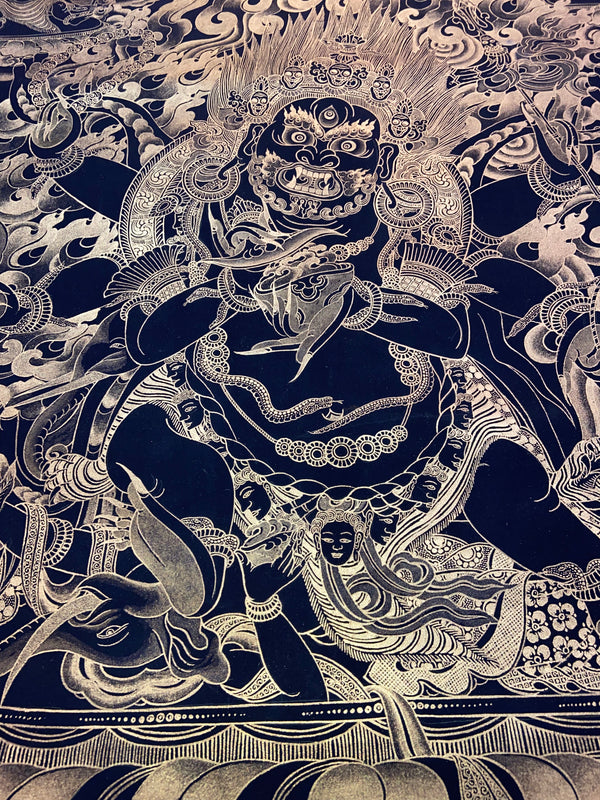 Mahakala is traditionally depicted as black, symbolizing his all-encompassing nature. The color black represents the absorption and dissolution of all colors and forms, signifying the nirguna (ultimate reality) – beyond all qualities and forms. This concept underlines Mahakala’s transcendental and comprehensive power.