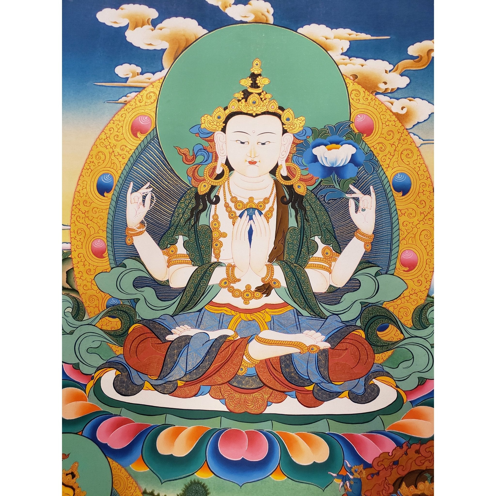 About Chenrezig – The Bodhisattva of Compassion Chenrezig, also known as Avalokiteshvara, is one of the most revered deities in Mahayana Buddhism. As a bodhisattva, Chenrezig has achieved complete enlightenment but chooses to remain in the world, aiding all sentient beings in their path to liberation. His compassion is boundless, and he is often depicted with multiple arms, each holding a tool to assist in his mission of salvation.