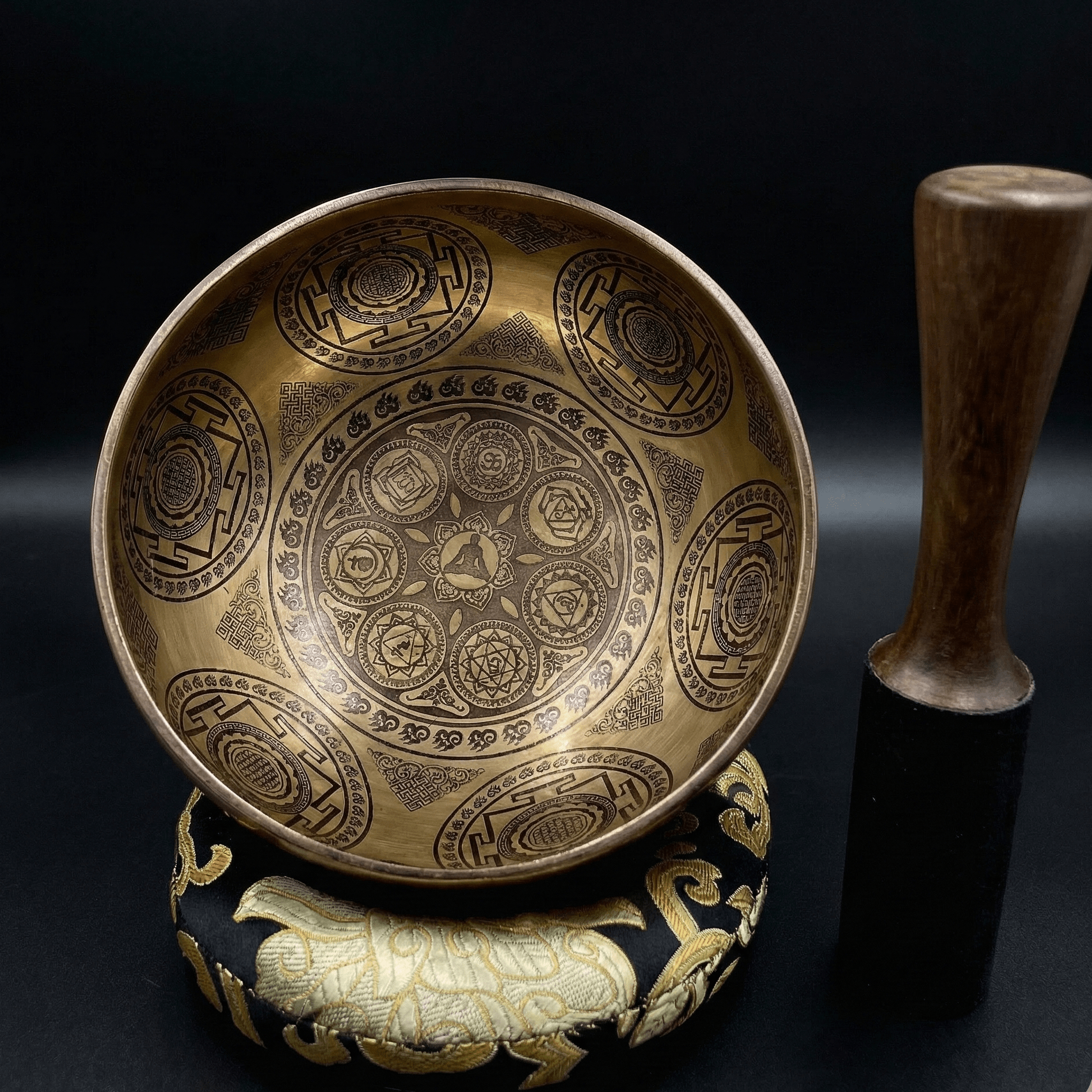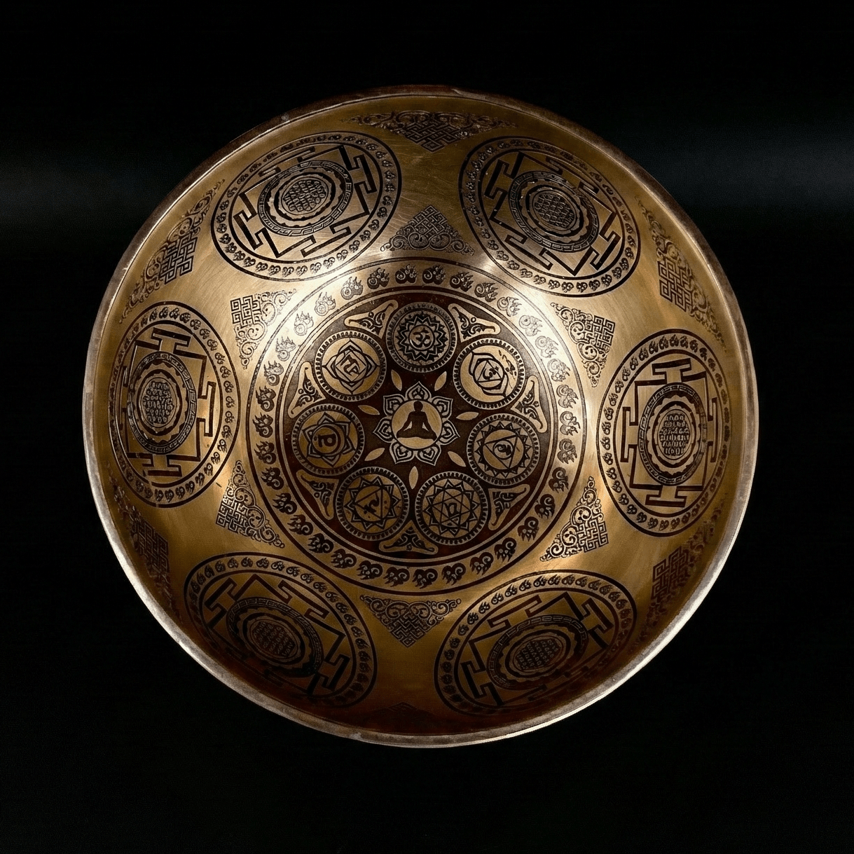 At the center of this singing bowl lies the Seven Chakra symbol, representing the energy centers that align the body and mind: