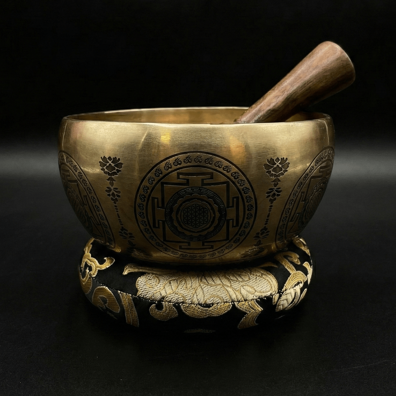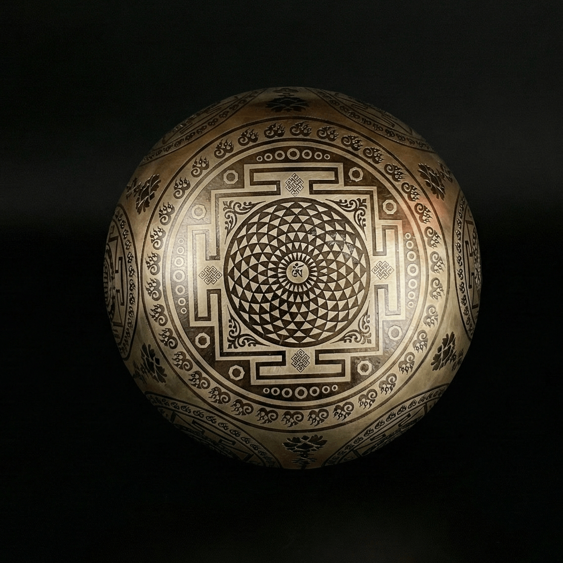 The Flower of Life and intricate geometrical patterns adorning the edges of the bowl symbolize the unity of all living things and the universe's sacred cycles. These designs are often used to deepen meditation and spiritual practices.