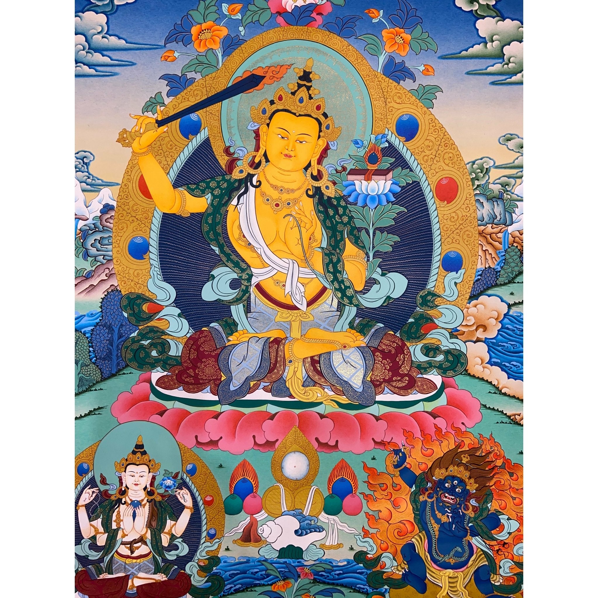 Surrounding Manjushri are flowers, symbolizing his purity. Just as a flower emerges untainted from the mud, Manjushri is free from the faults he once carried as an ordinary being. He is often depicted in a triad with Avalokiteshvara and Vajrapani, known as Rigsum Gonpo, embodying the essential qualities for enlightenment: compassion, wisdom, and power.
