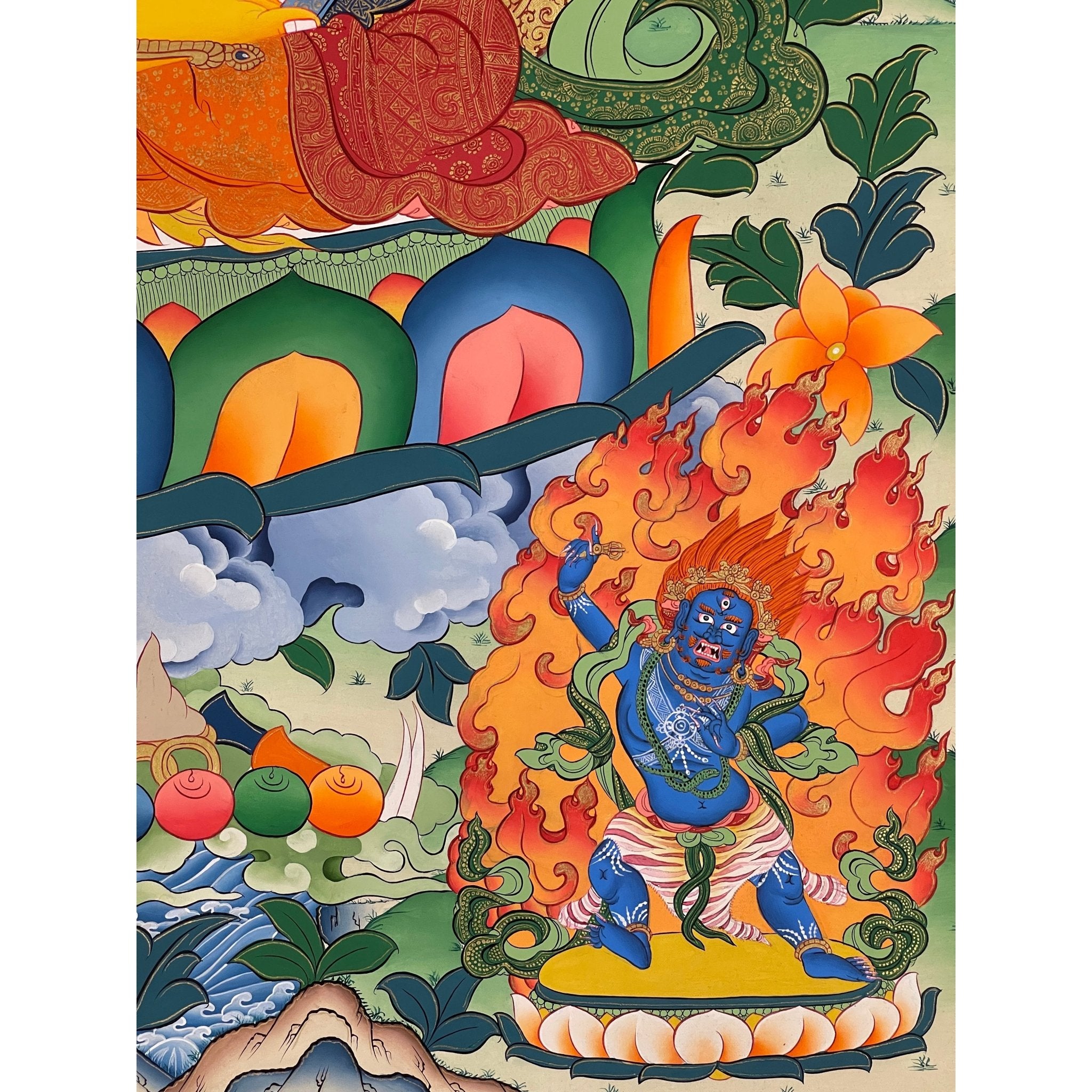 This 100% hand-drawn Thangka, crafted with dedication in the Kathmandu Valley, Nepal, is perfect for various home décor ideas. Whether as an elegant centerpiece in your home or office or as a sacred piece on your family altar, this Thangka brings both aesthetic and spiritual value. It attracts the benevolent energy of Tibetan Buddhist art, enhancing meditation, emotional healing, and spiritual growth.