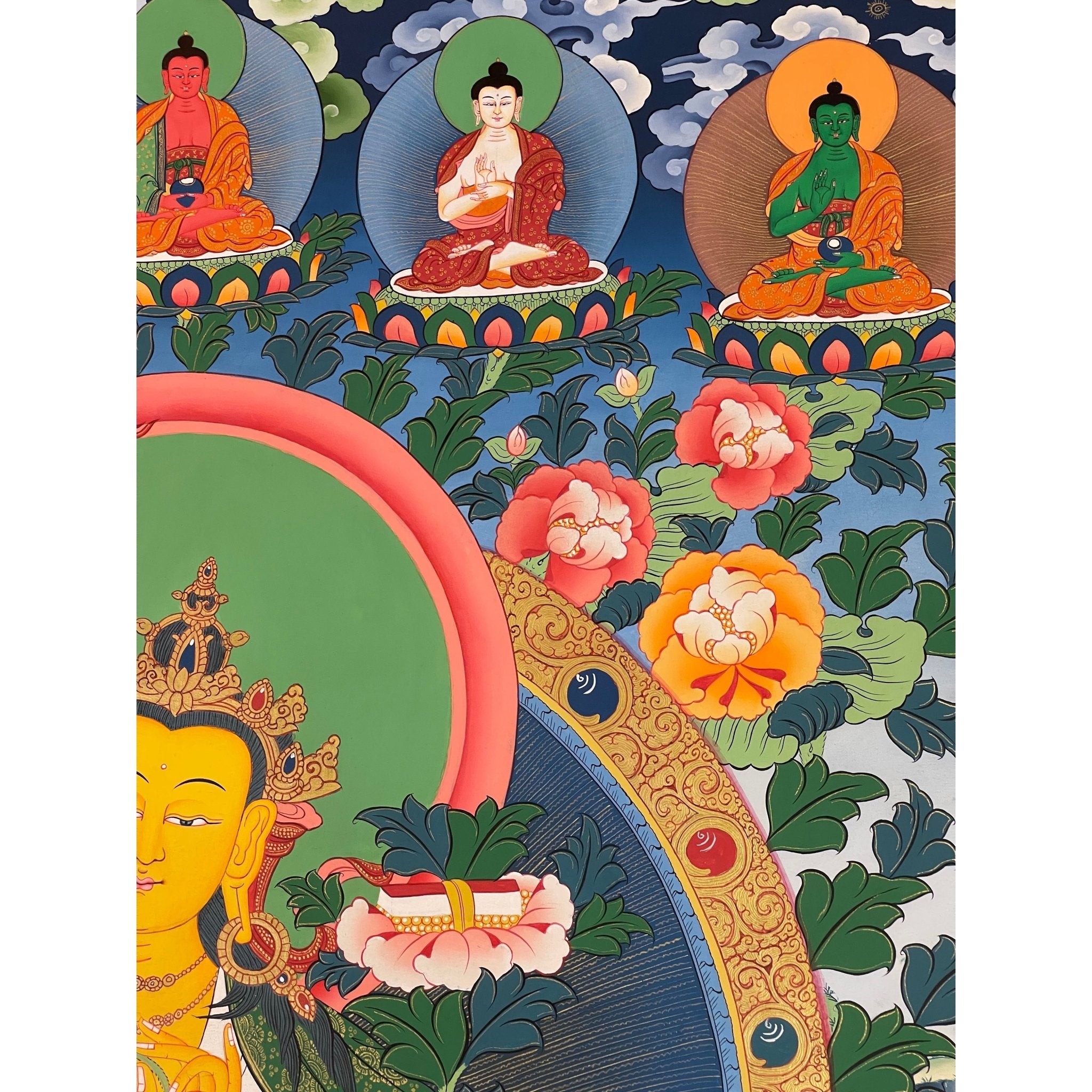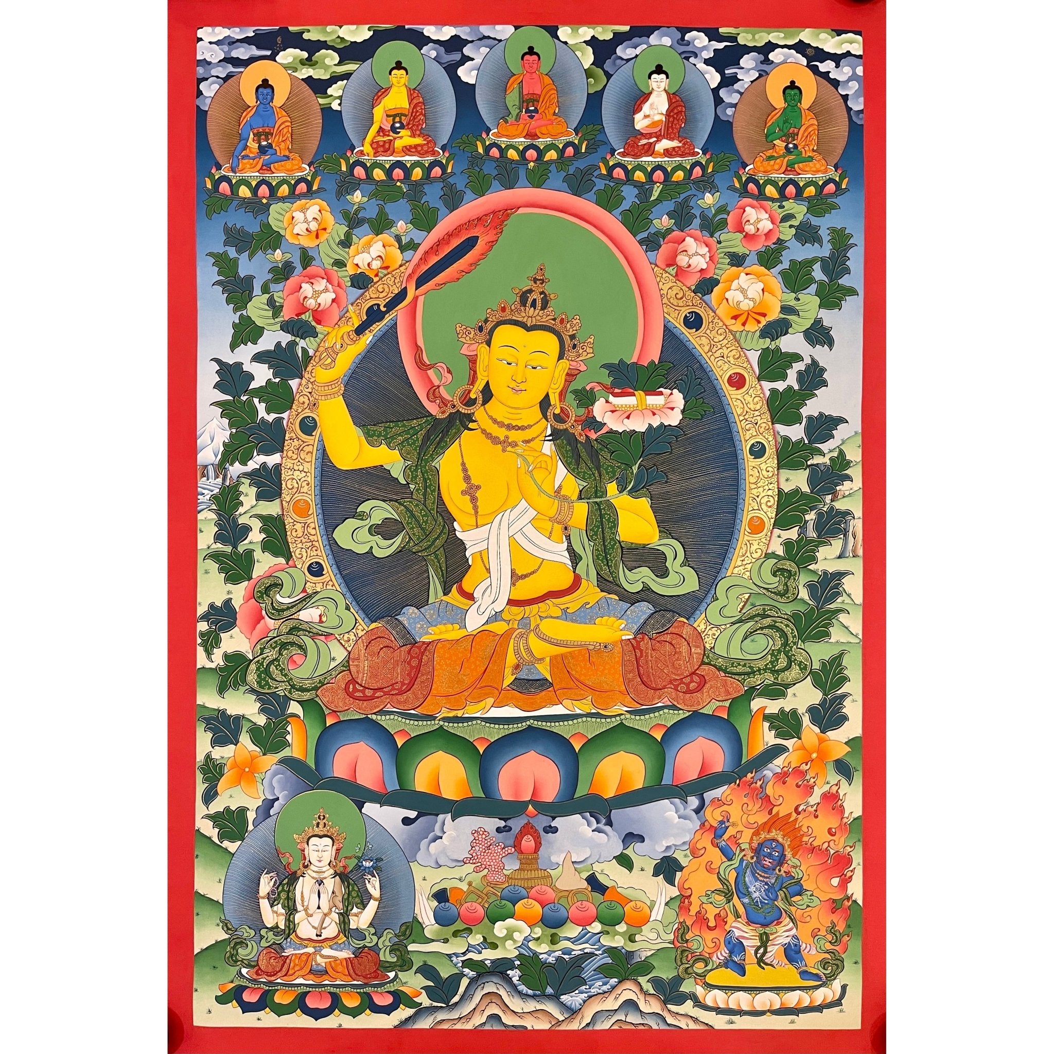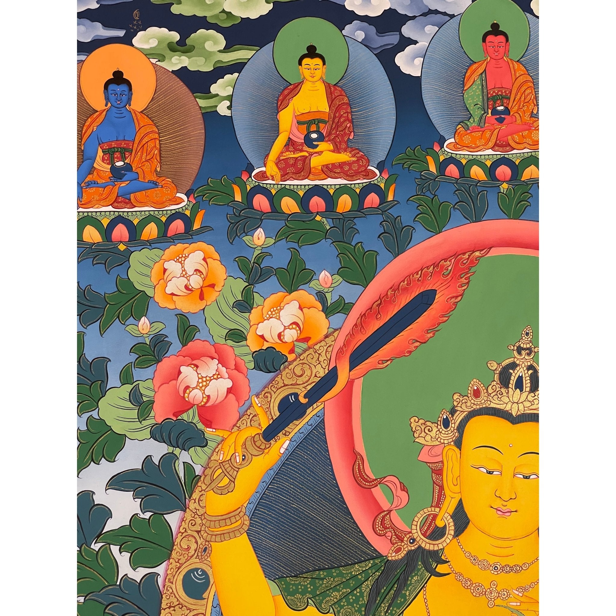 Manjushri’s image serves as a constant reminder to cultivate wisdom and enlightenment. Displaying this Thangka invites the qualities of knowledge and purity into your life, inspiring spiritual growth and clarity.