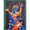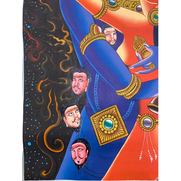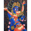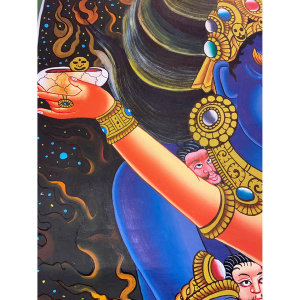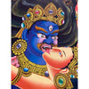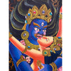 The Thangka depicts Shri Chakrasamvara, a blue deity with four faces (blue, red, yellow, and white) and twelve hands. Each face is adorned with three eyes and bared fangs, symbolizing his profound wisdom and power. Chakrasamvara’s posture is dynamic, as he presses his right leg on the breast of Kalaratri, a fierce red deity, and his left leg on the head of Yama, the lord of death.