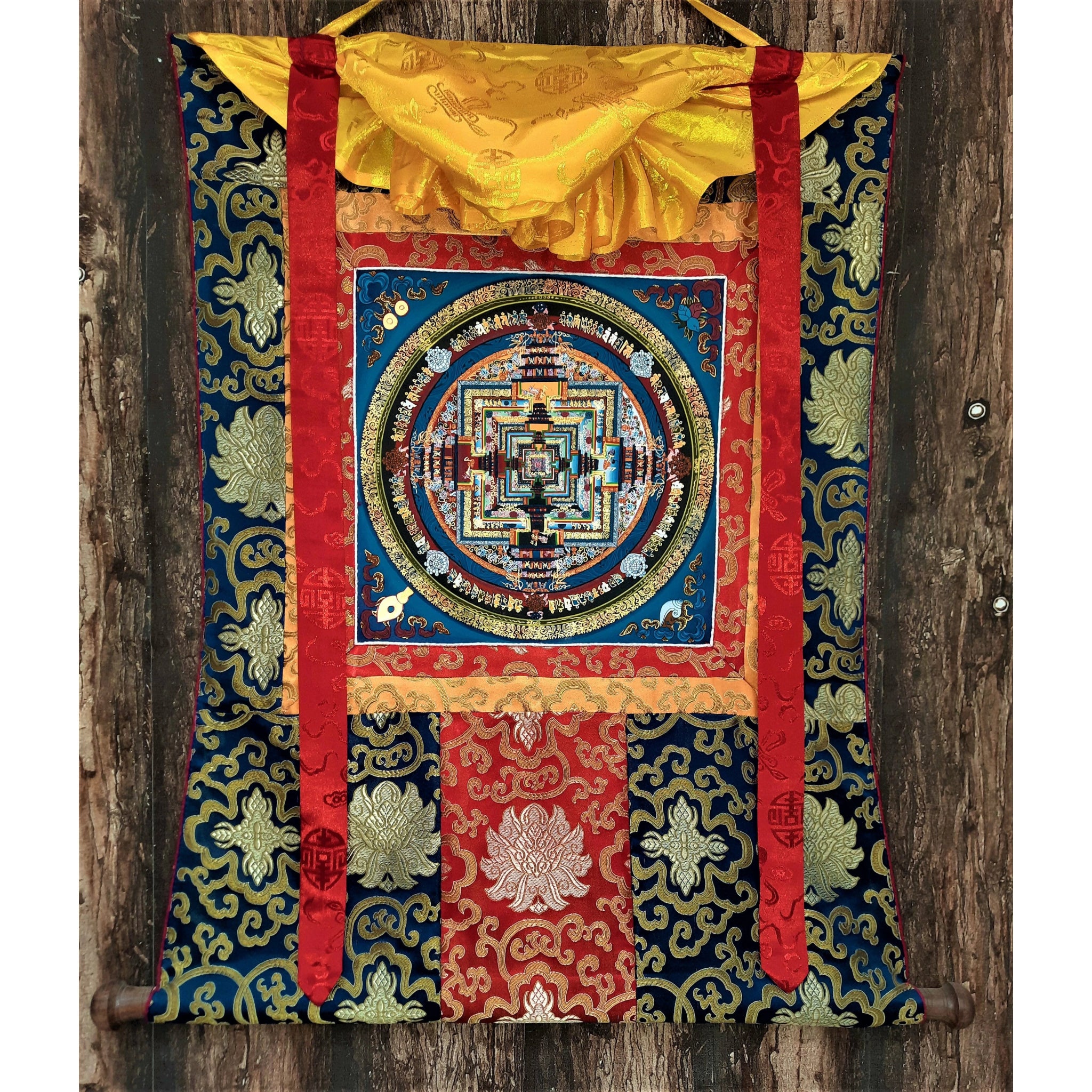 The silk fabric protects the edges of the Thangka, and also makes it easier to hang. A thin silk cover protects the painting when rolled, and may be gathered up to display the painting when hung on the wall. It is generally thought that silk brocade renders a Thangka more attractive and more religious.