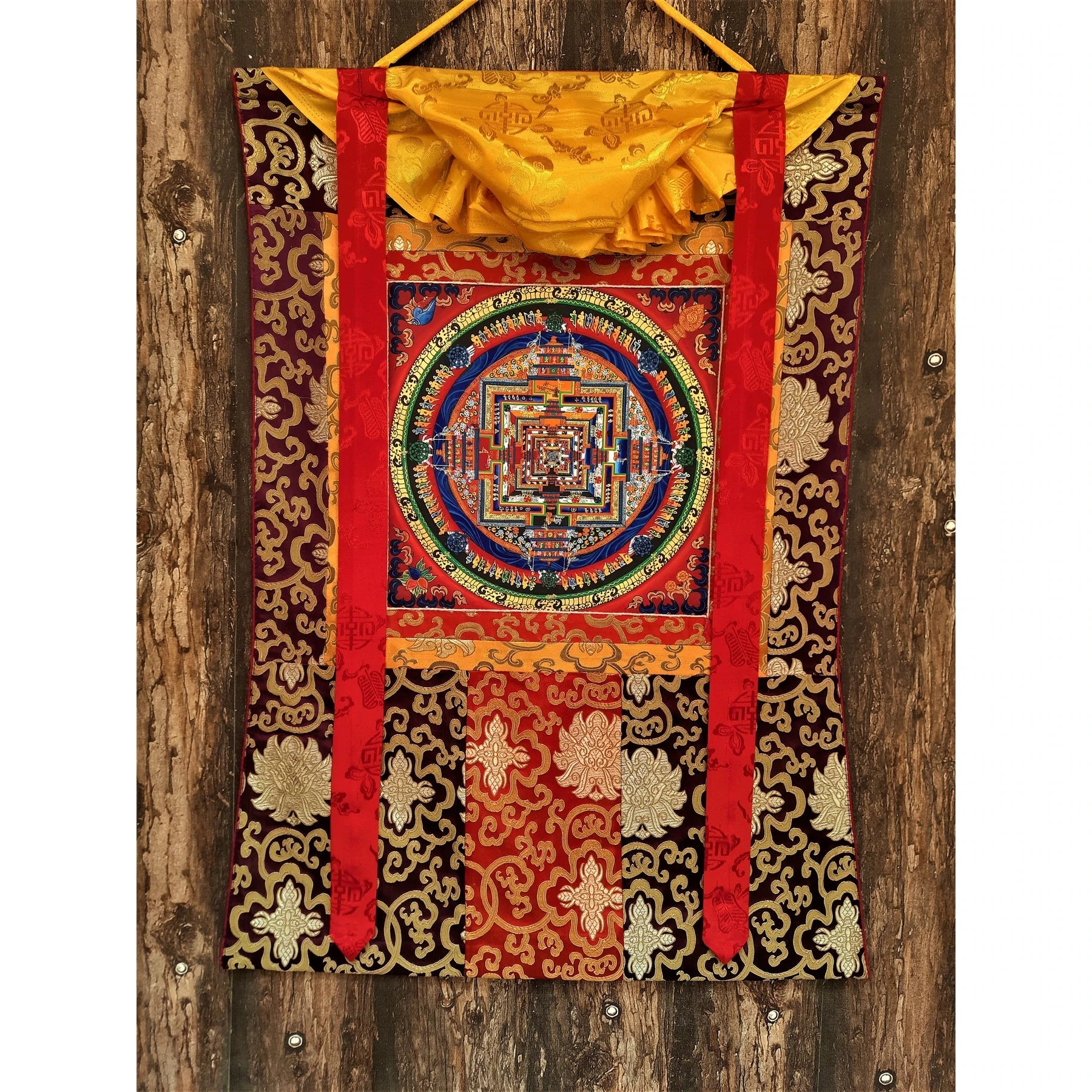 Silk brocading is a traditional Tibetan art form used to beautifully frame and decorate a Thangka. The brocade frame is made from rich silk fabric featuring vibrant colors, intricate patterns, and timeless elegance.