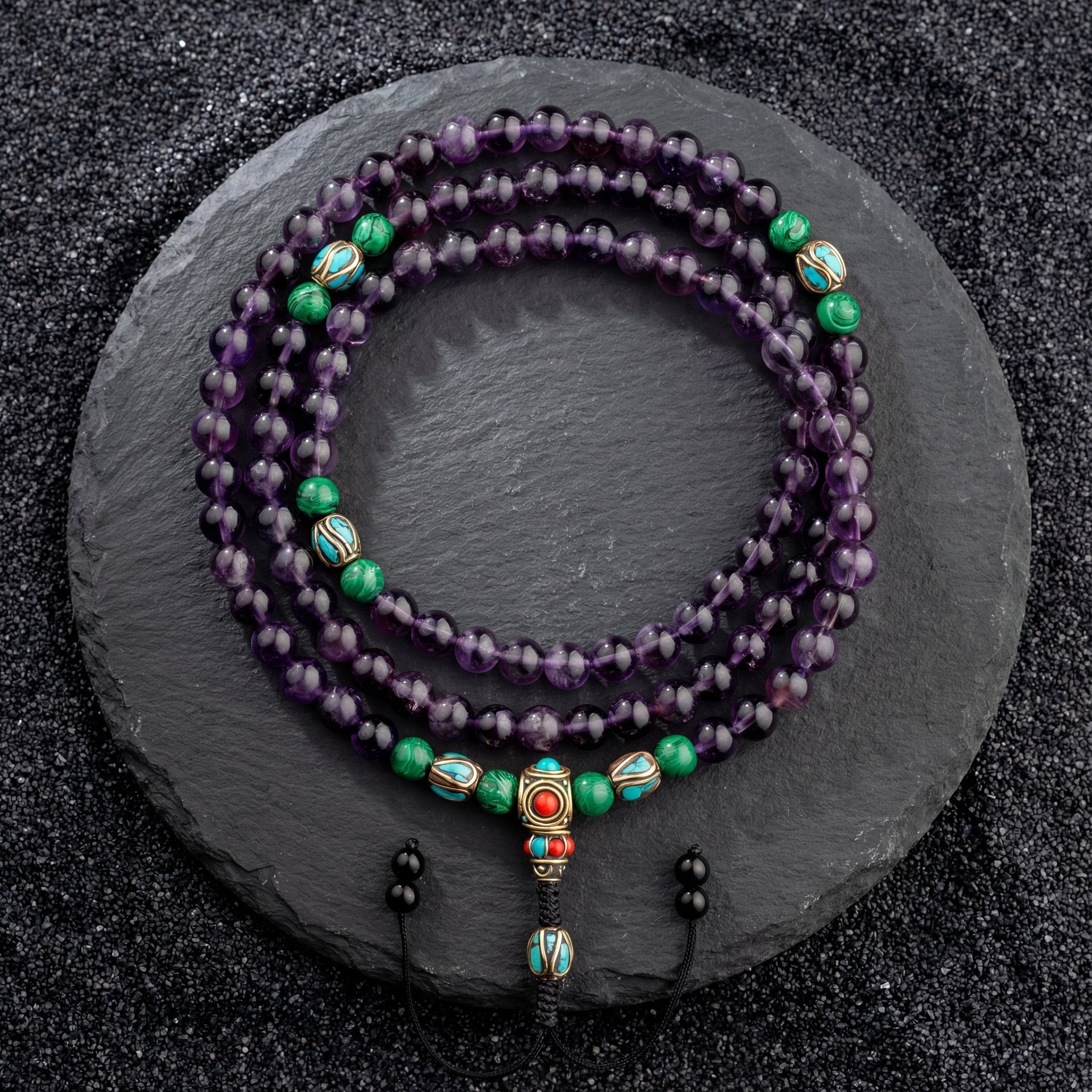 The amethyst Mala is very beautiful. The distribution of the colored beads is perfect. The only thing I can say is I think the beads are strung too tight which makes the object quite stiff.