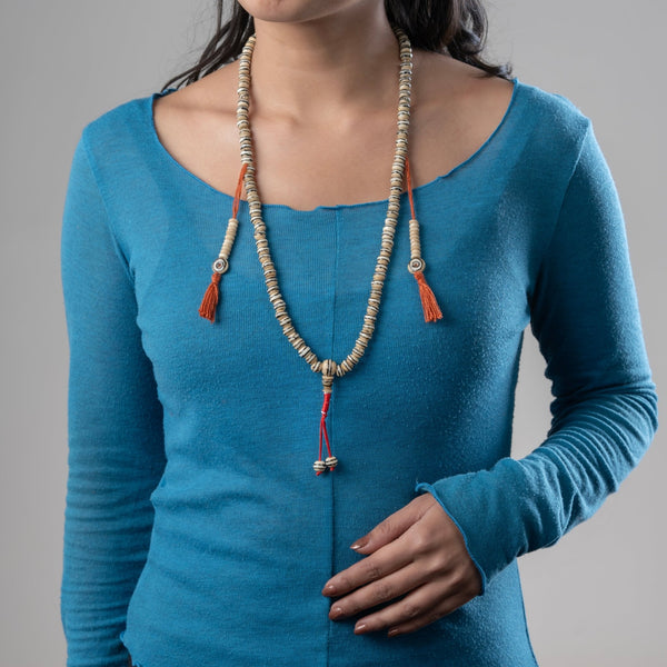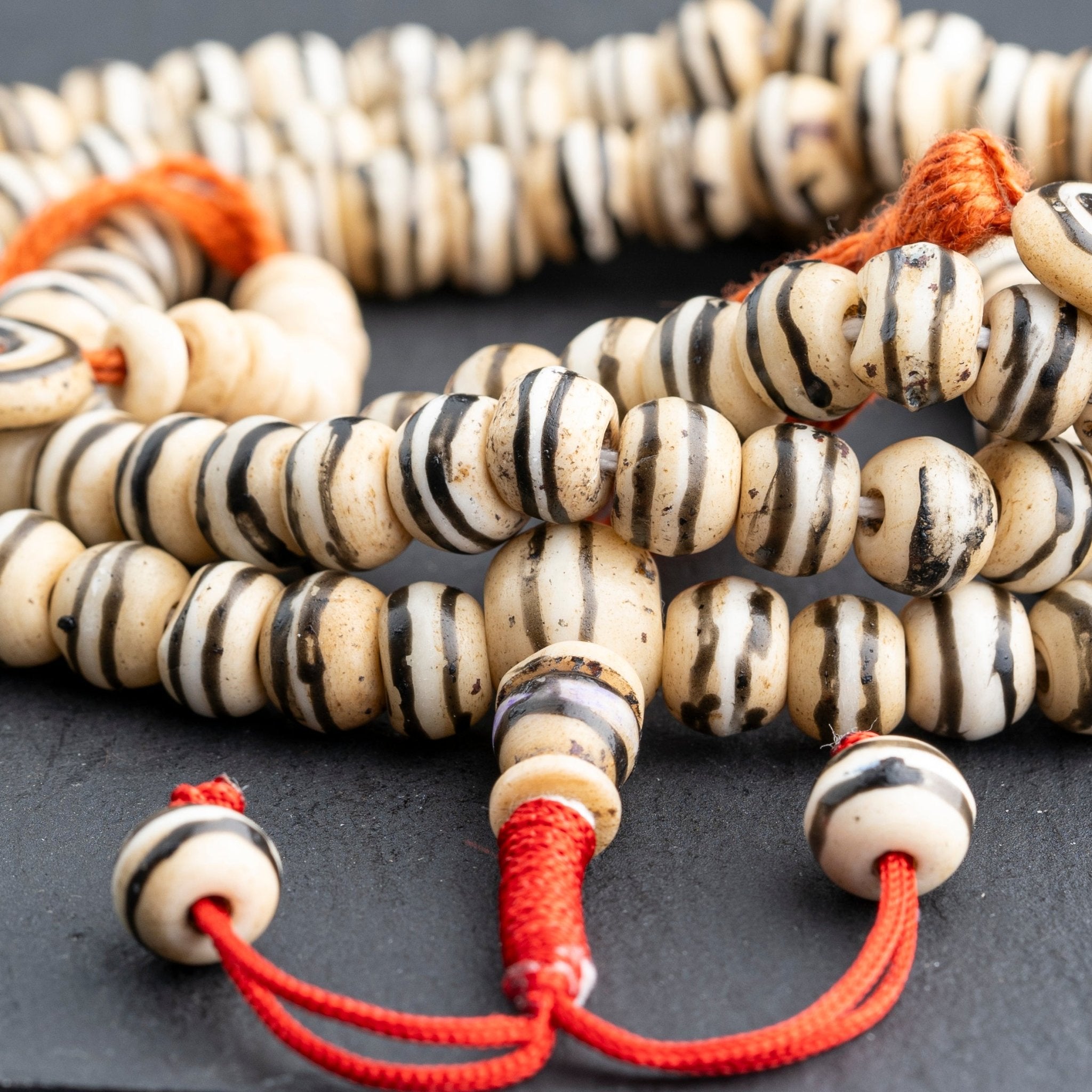 This antique-style mala is created from naturally dyed yak bone beads that are handcrafted by skilled artisans in the Himalayas. In this region, large animals such as yaks and water buffalo are utilized for various purposes, including food, clothing, and spiritual items. Due to the limited resources in the area and the deep-rooted religious practices, there is a strong emphasis on ensuring that nothing goes to waste. The artisans recycle and reuse everything in daily life, integrating these practices into their spiritual rituals and craftsmanship.