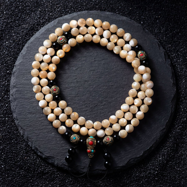 Mother of Pearl is known for its soothing and calming properties, offering a sense of tranquility and emotional balance. As a protection stone, it brings the gentle healing power of the sea, creating a peaceful environment. This mala helps relieve stress, stimulates intuition, and enhances sensitivity and adaptability, making it a perfect companion for emotional well-being.