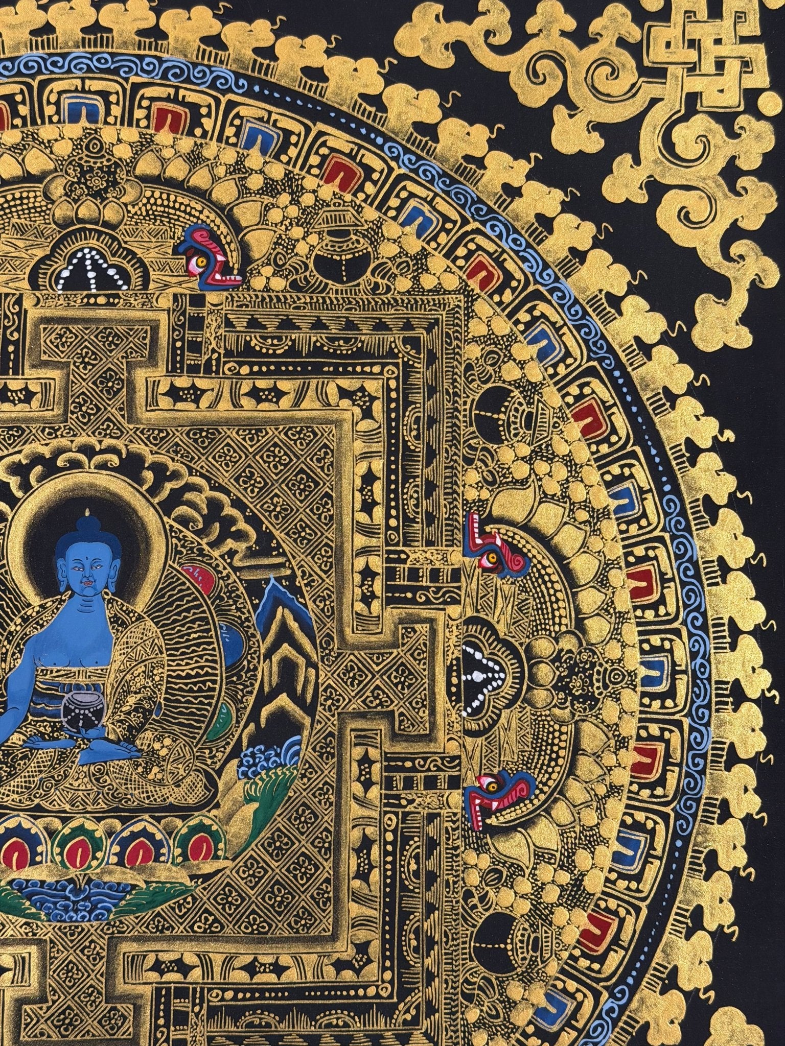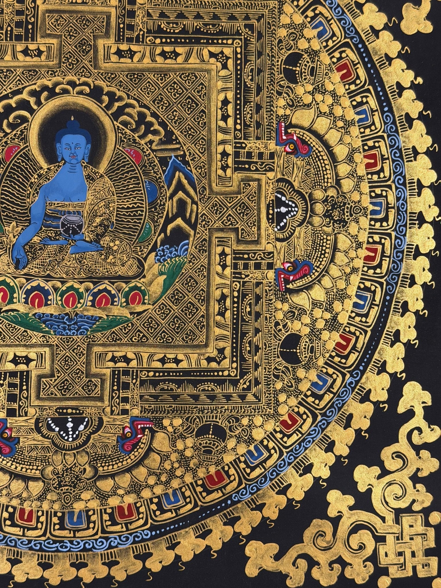 This Medicine Buddha Mandala Thangka features Bhaisajyaguru, the Medicine Buddha, the embodiment of healing, compassion, and spiritual medicine. Known as the “Doctor of Enlightenment,” the Medicine Buddha represents the healing of physical illness, emotional suffering, and mental afflictions.