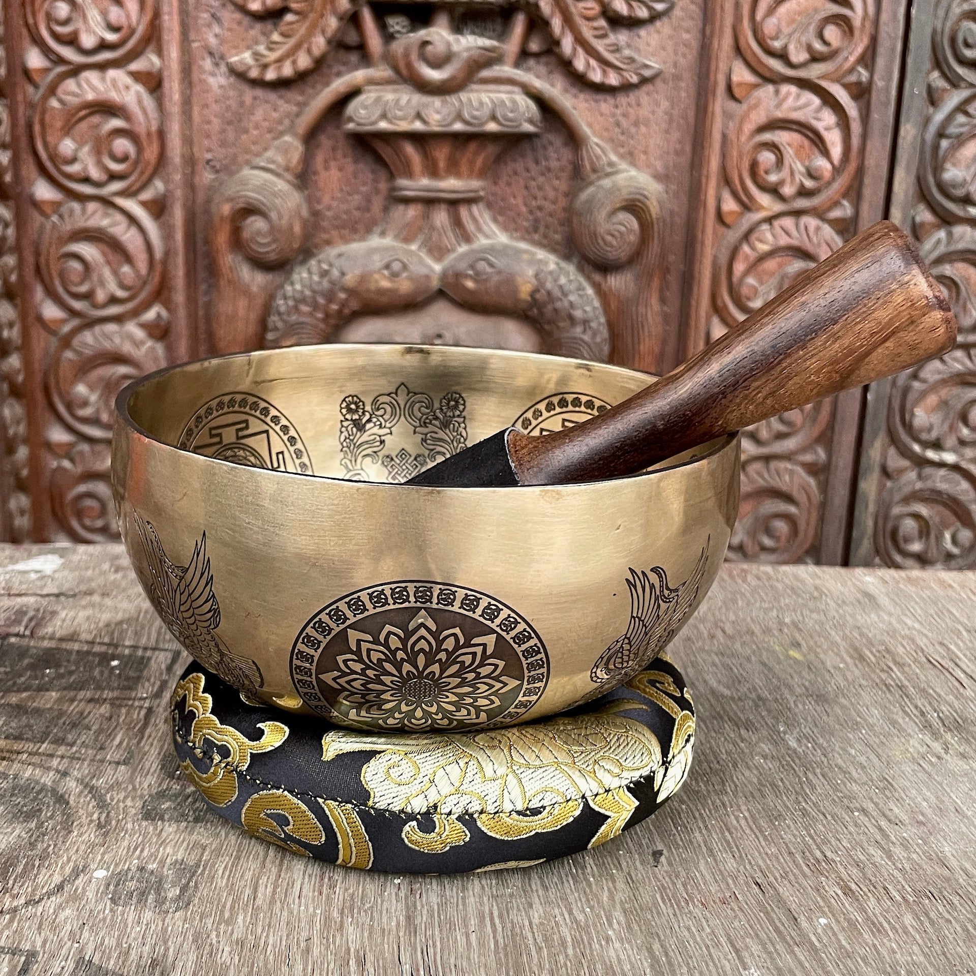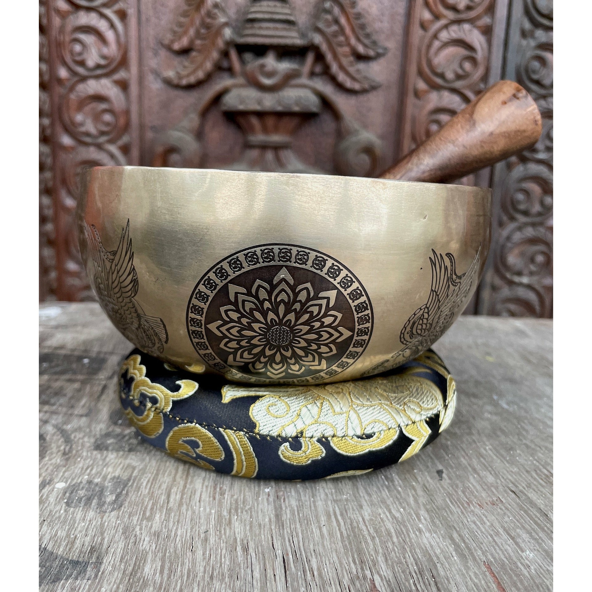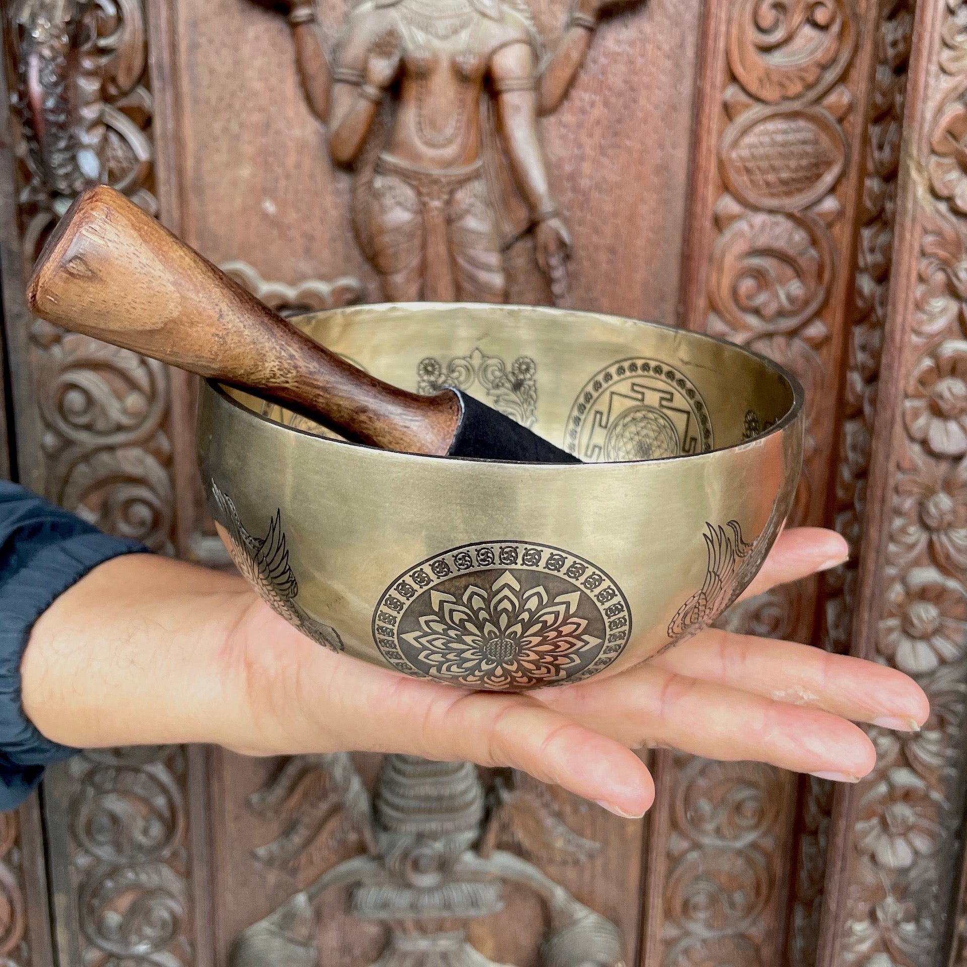 The base of the bowl features sacred geometry patterns, including the Kalachakra and Flower of Life, which are powerful tools for meditation and spiritual connection. These designs encourage mindfulness, helping you achieve a deeper state of tranquility during your practice.