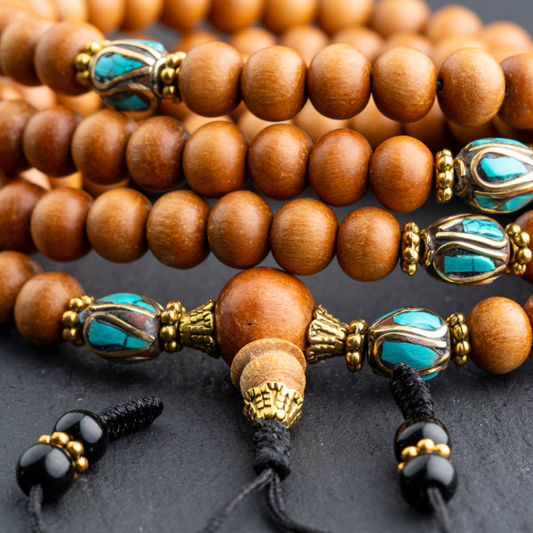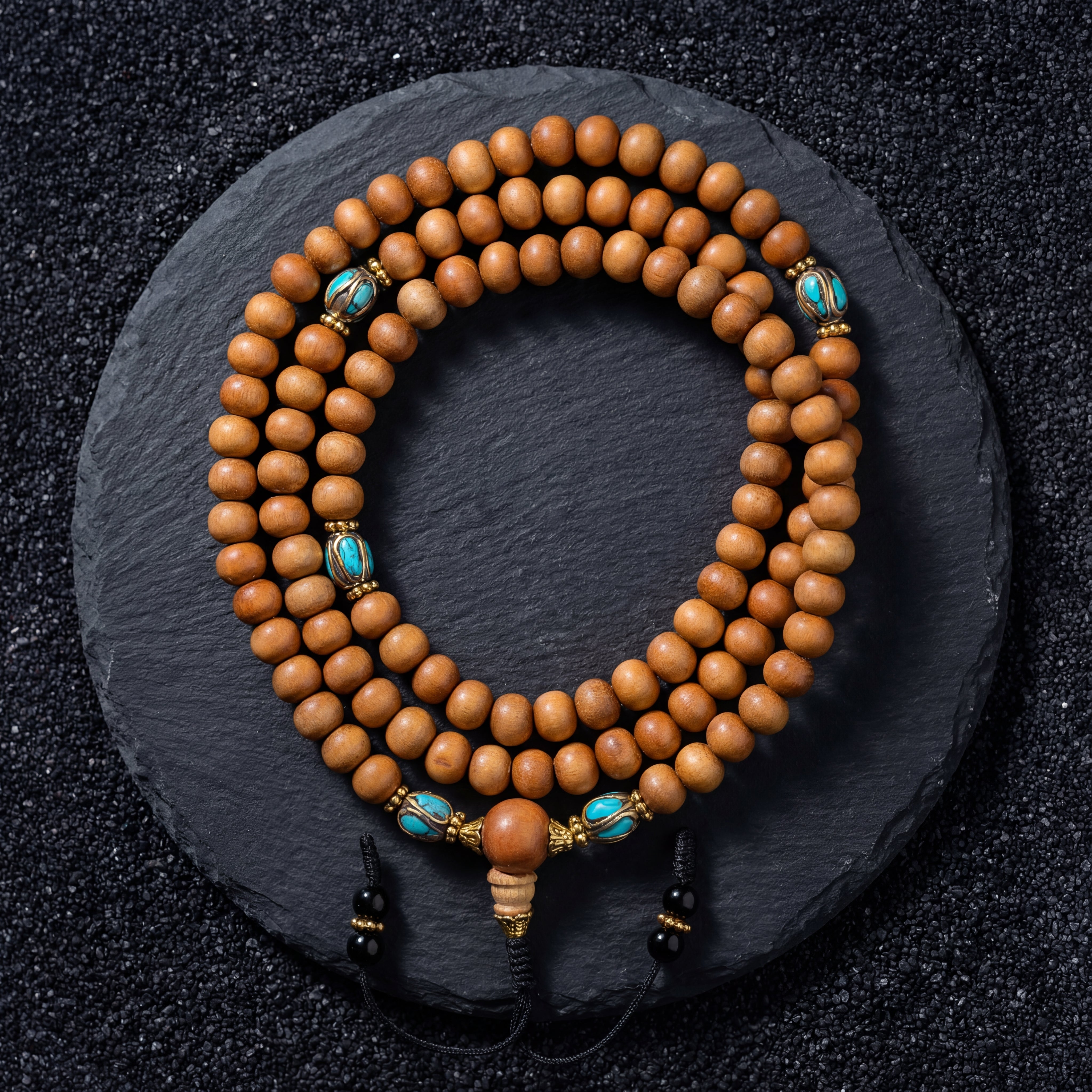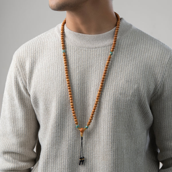 Wear this mala to experience the calming and grounding benefits of sandalwood, enhancing your spiritual practice and emotional well-being.