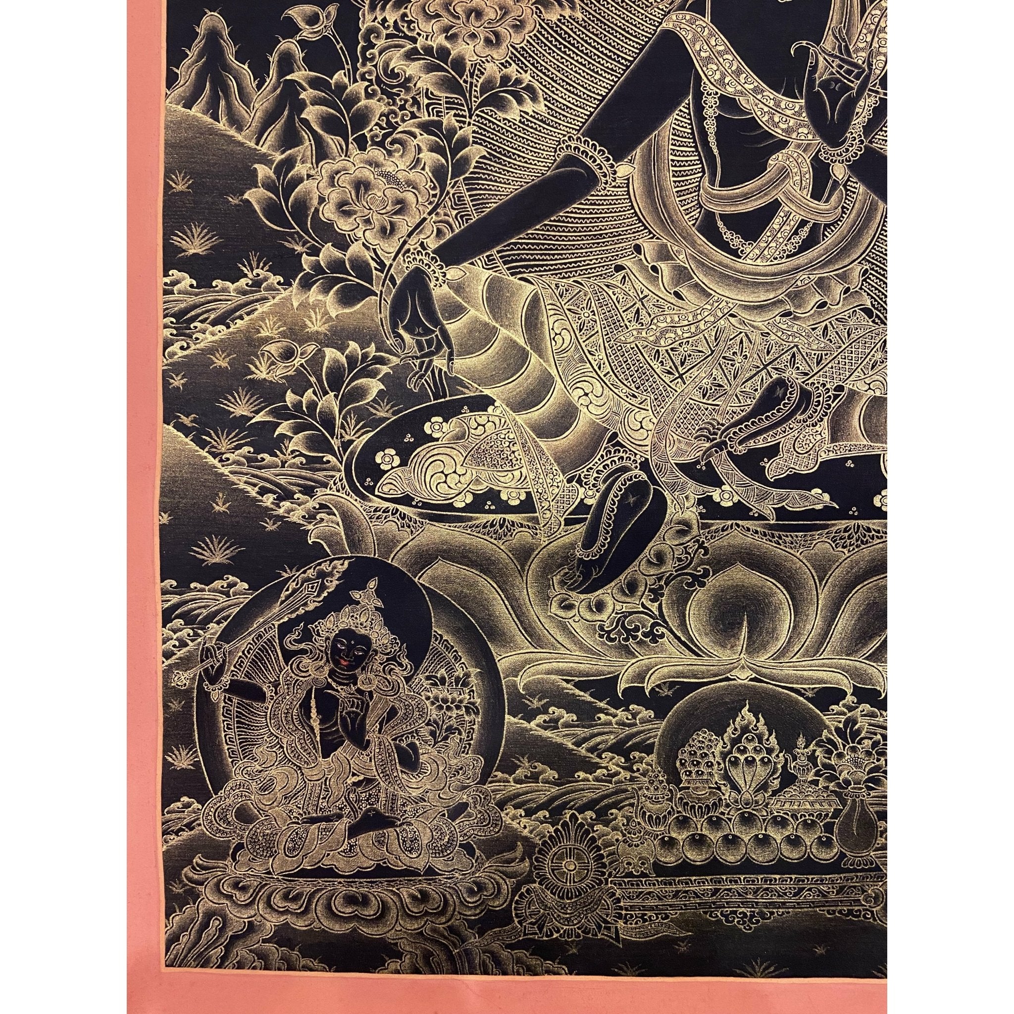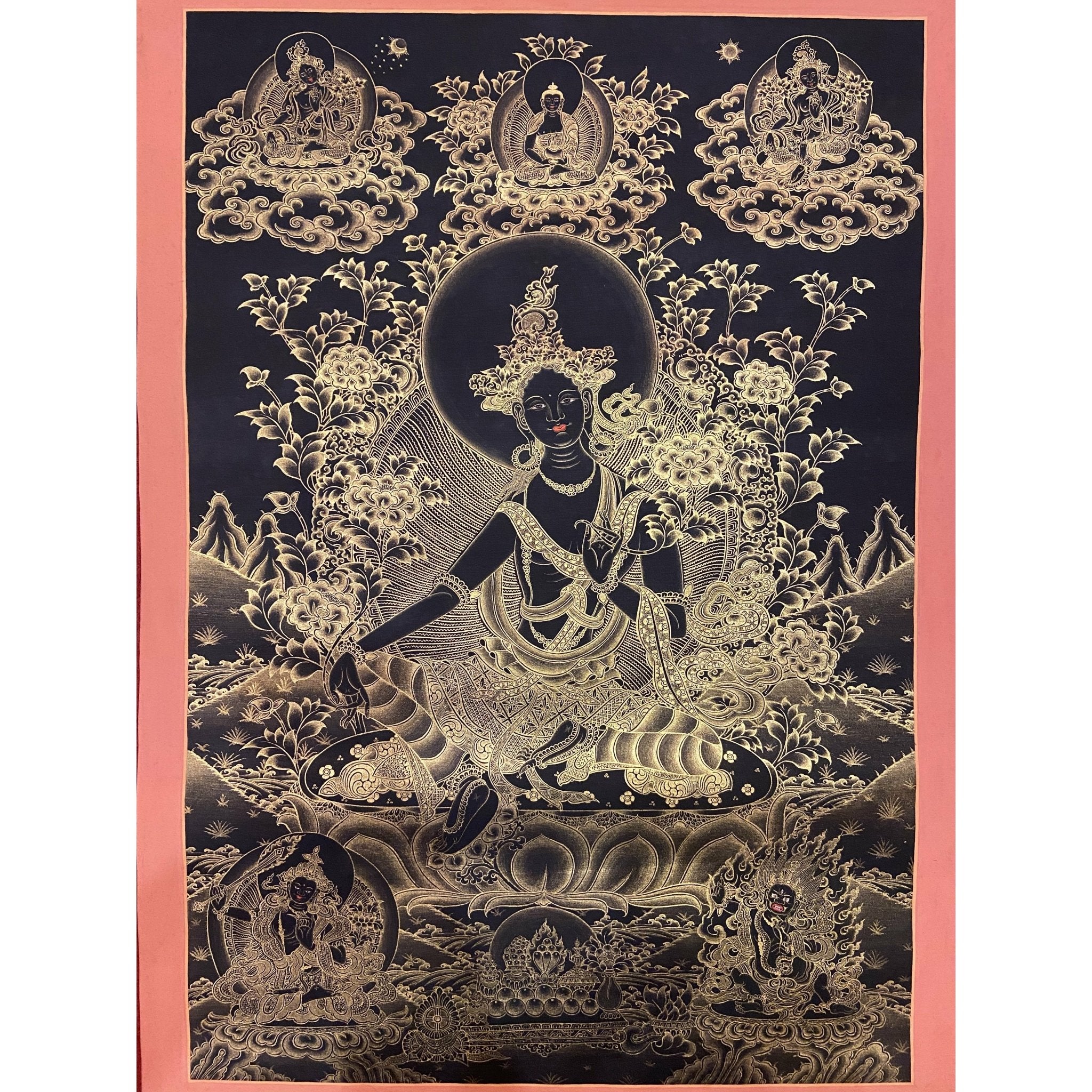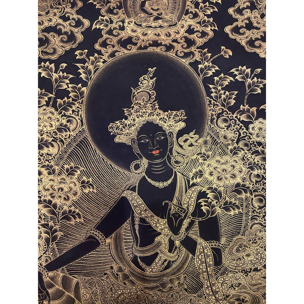 Elegant Art: Crafted with black and Tibetan gold dust, this Thangka enhances any space with its serene beauty and deep spiritual meaning.