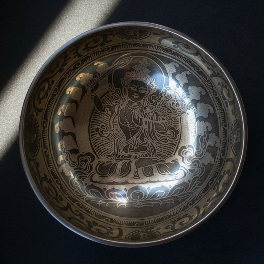 Handcrafted Tibetan Singing Bowl with Manjushri, Om Mani Padme Hum Mantra, and Vajra Symbol