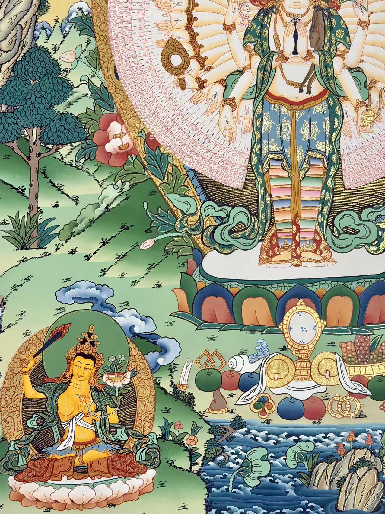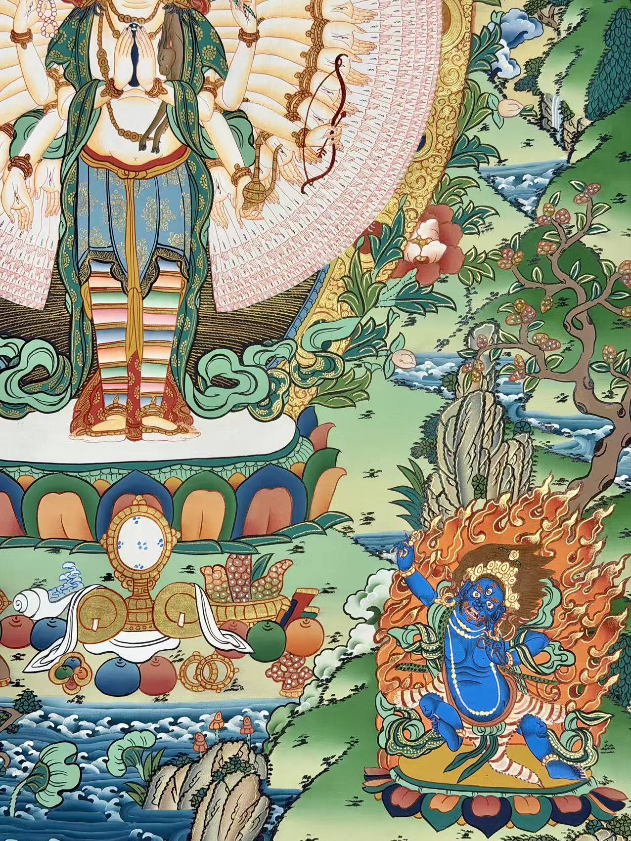 In this Thangka, Avalokiteshvara is depicted with his thousand arms, each featuring an eye on the center of the palm, symbolizing his infinite wisdom and clarity. Of his eleven heads, ten are peaceful, representing his gentle, compassionate actions, while one head is wrathful, signifying that sometimes compassion manifests through forceful means. His outstretched arms and the eyes on his palms symbolize his unwavering desire to reach out to those lost in samsara, with the wisdom to help them find liberation.