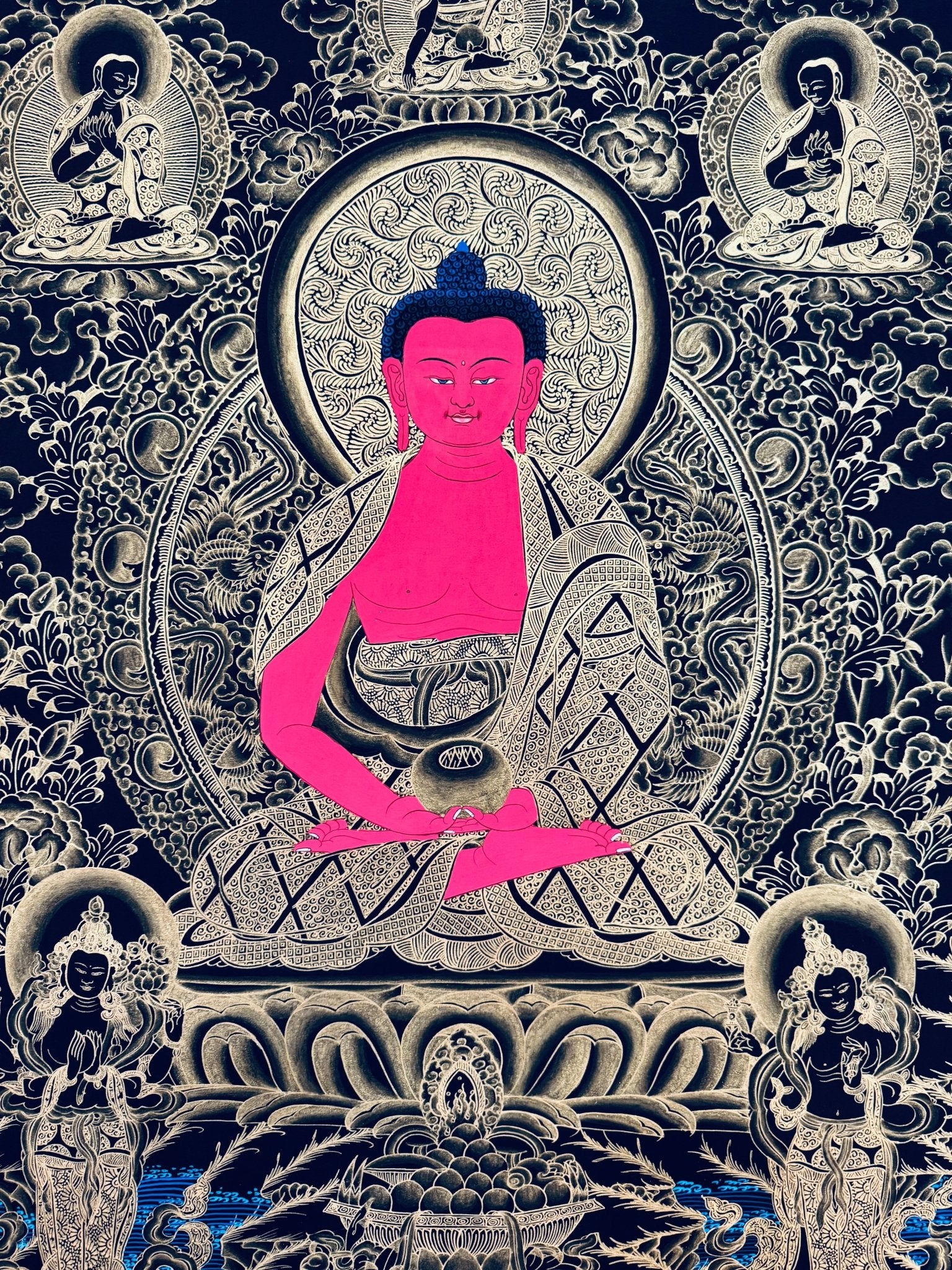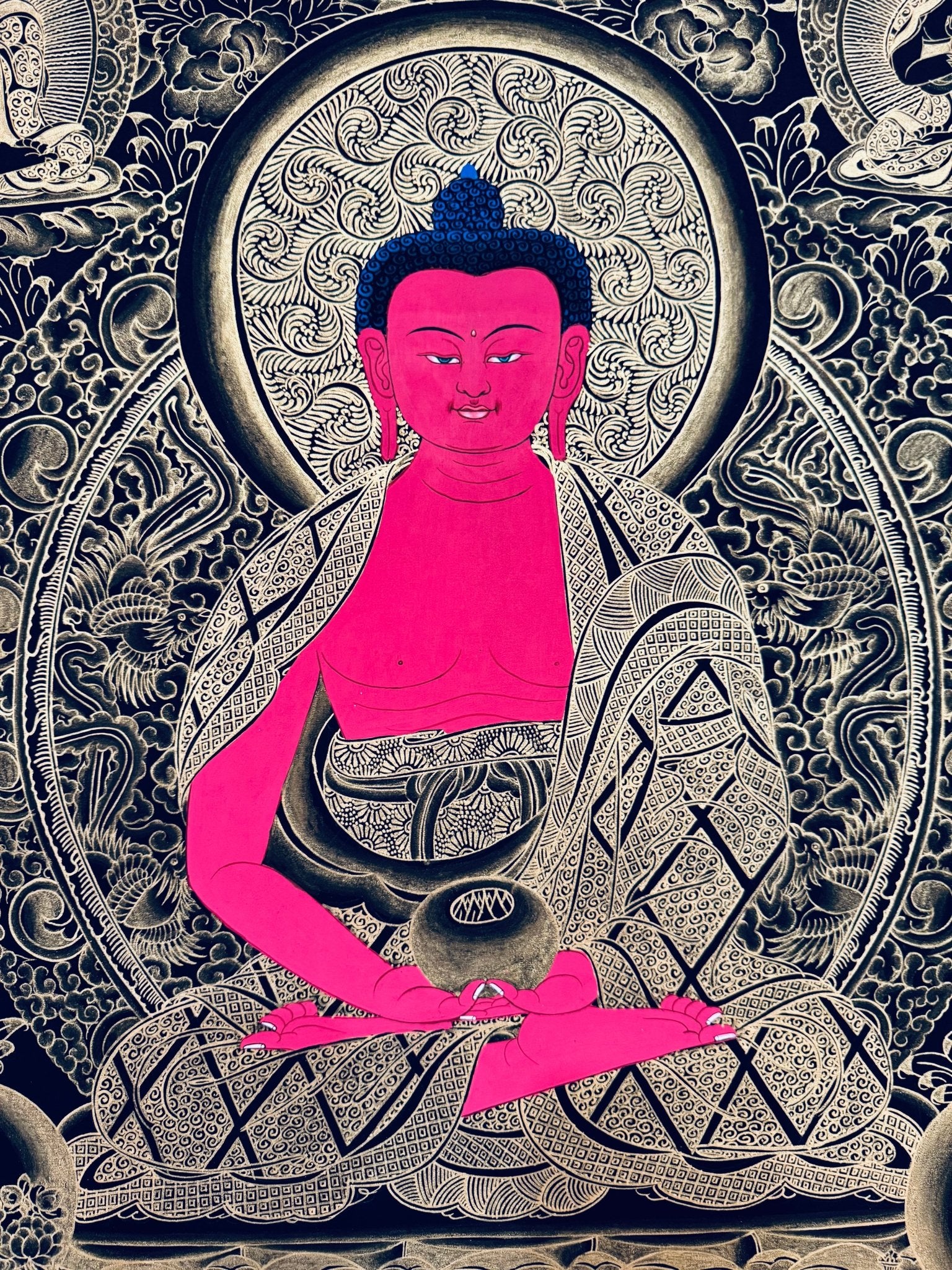 This 100% hand-drawn Tibetan Thangka painting depicting Amitabha Buddha is the perfect addition to any home décor. Created with love and care in Nepal, it serves as an elegant centerpiece for your living space, office, or family altar. The painting’s spiritual energy encourages meditation, emotional healing, and the attraction of benevolent Tibetan Buddhist influences. It also acts as a powerful tool for inner peace and spiritual growth.