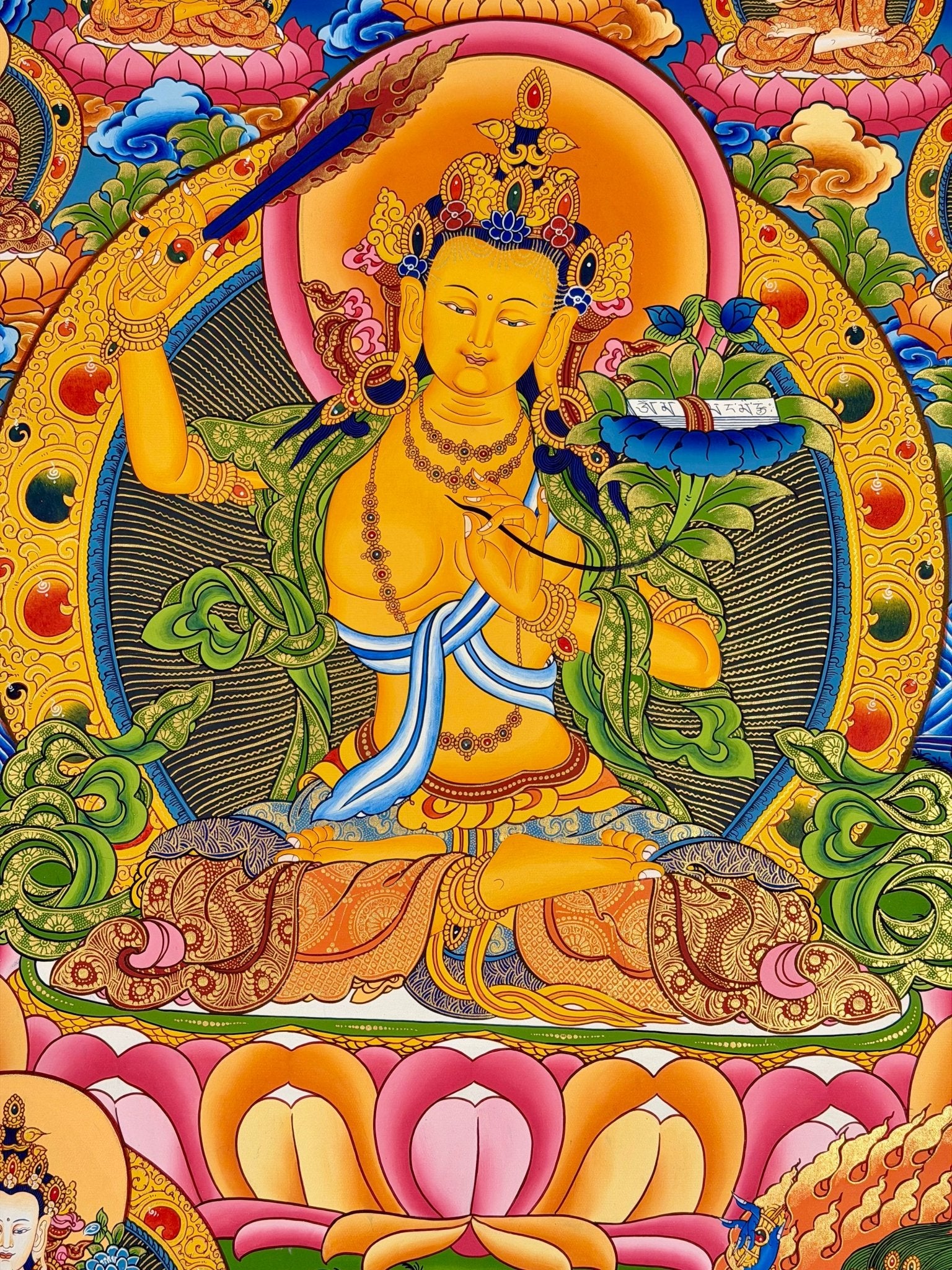 In this Thangka, Manjushri's golden skin radiates multi-colored rays, symbolizing the many paths through which he leads others to wisdom. The sword in his right hand represents the knowledge that cuts through ignorance, clearing the minds of unenlightened beings. In his left hand, he holds a sutra, representing the sacred teachings that instill wisdom and ignite the journey toward omniscience.