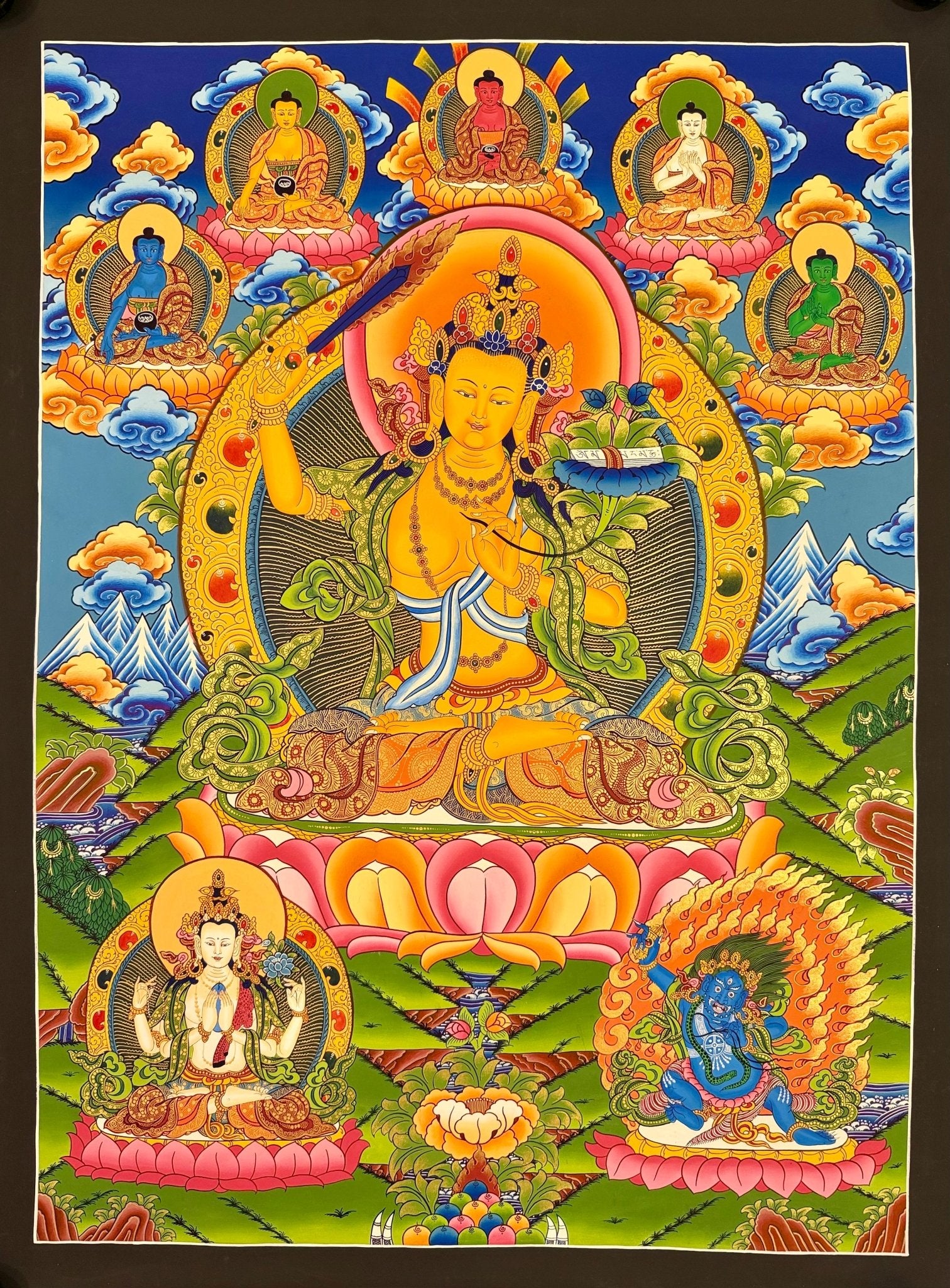 Surrounding Manjushri are flowers, symbolizing his purity. Just as a flower emerges untainted from the mud, Manjushri is free from the faults he once carried as an ordinary being. He is often depicted in a triad with Avalokiteshvara and Vajrapani, known as Rigsum Gonpo, embodying the essential qualities for enlightenment: compassion, wisdom, and power.